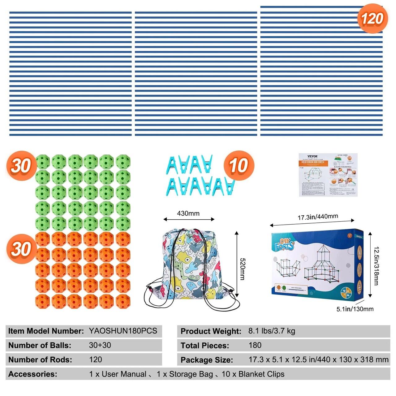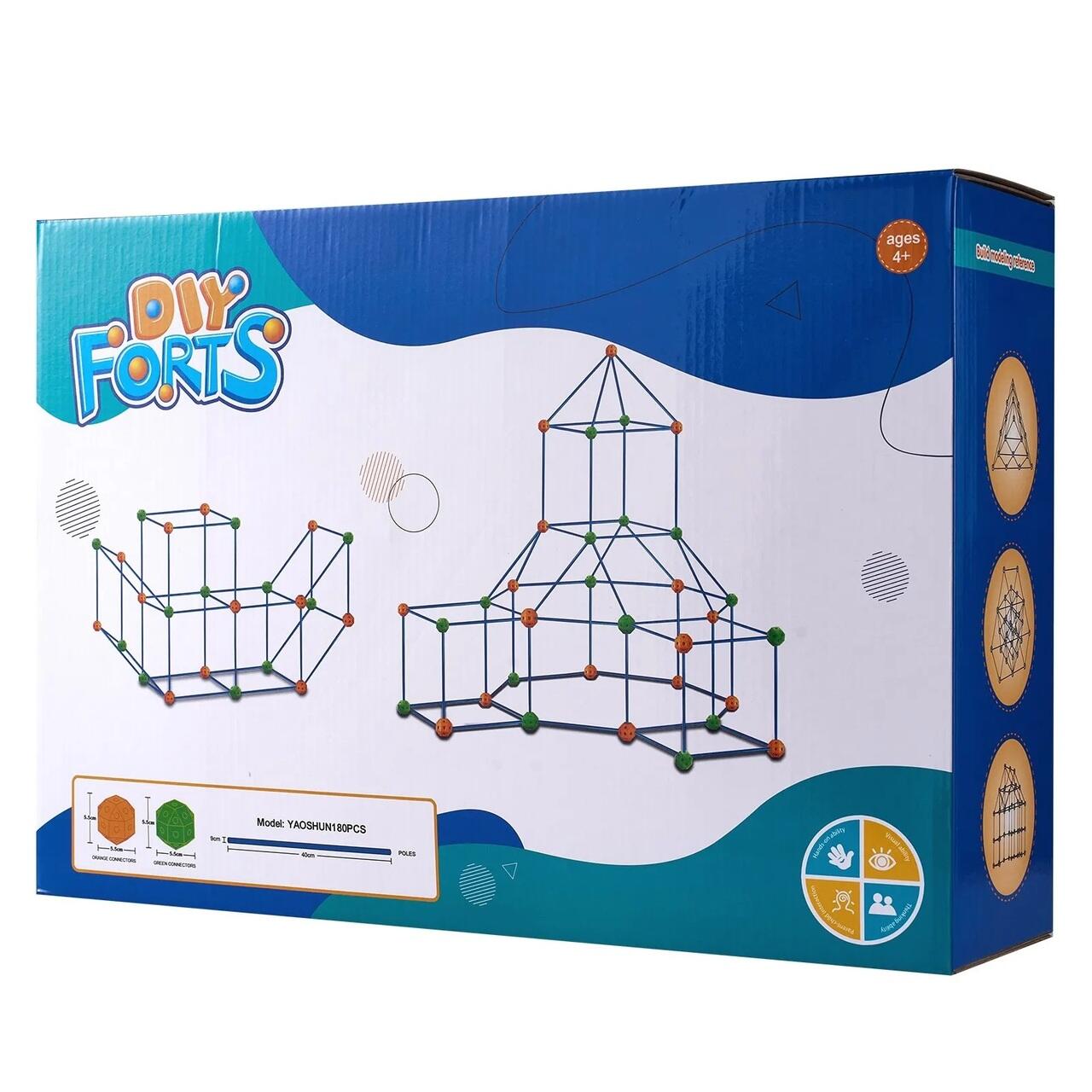Kit de constructie fort cu 180 de piese: Exploreaza posibilitati nelimitate cu kitul nostru de constructie fort pentru copii! Include 60 de bile solide si 120 de biele usoare, dar durabile. Perfect pentru copiii cu varsta de 4 ani si peste, pentru a-si crea propriile spatii 3D - construieste forturi, corturi, piramide, rachete si multe altele cu indrumarea parintilor.