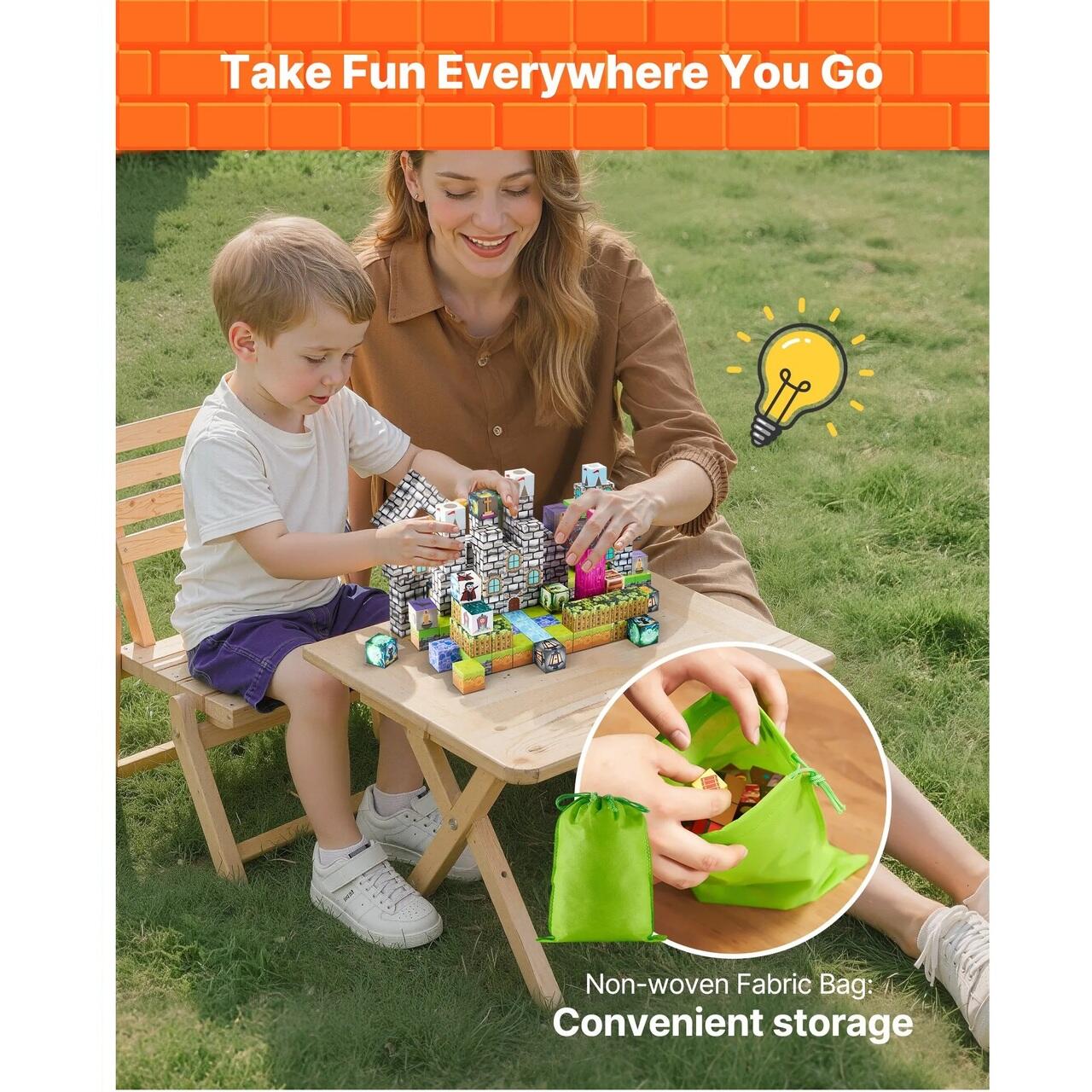 Depozitare usoara: Geanta de depozitare din material textil inclusa face curatarea rapida si usoara. Cuburile noastre magnetice de constructie sunt usoare si portabile, astfel incat copilul dumneavoastra le poate lua oriunde pentru distractie creativa in deplasare.