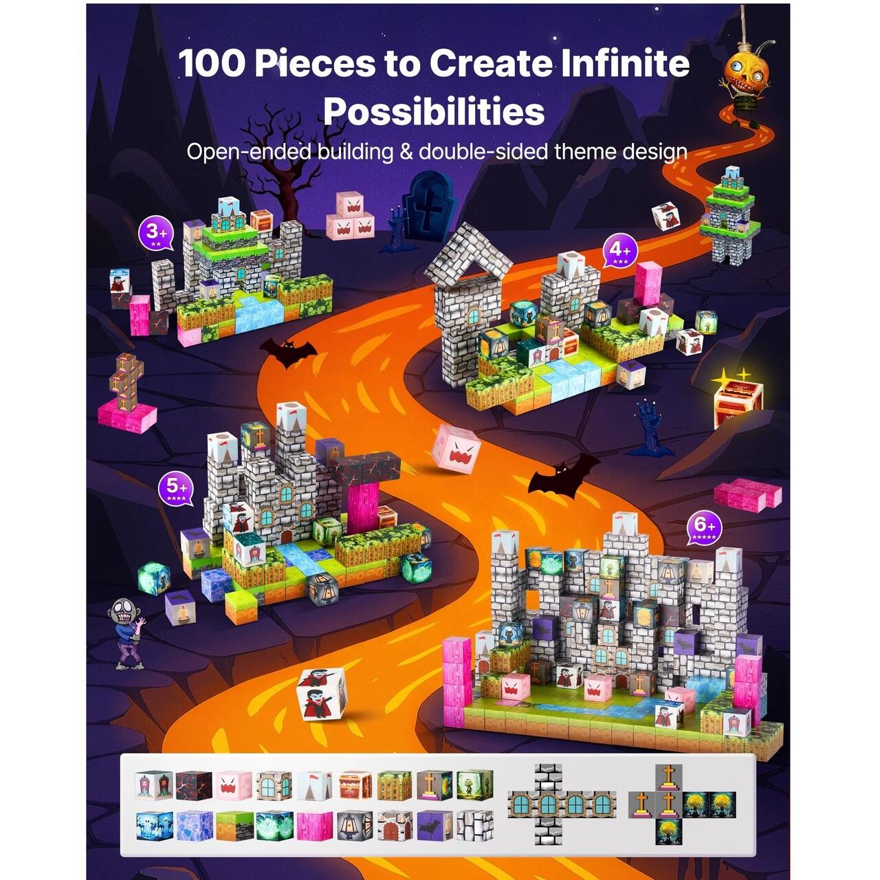 Constructie libera si teme cu doua fete: Cu 100 de blocuri magnetice si teme cu doua fete, copilul tau poate crea modele plate, structuri 3D si chiar recreari emblematice! Combina si asorteaza cu alte seturi de blocuri magnetice pentru a construi povesti noi.