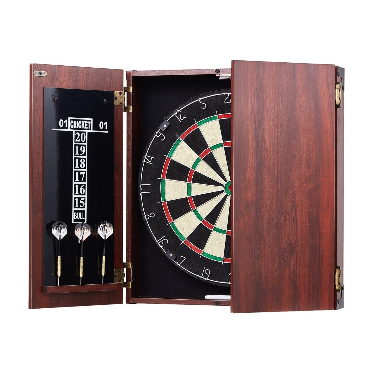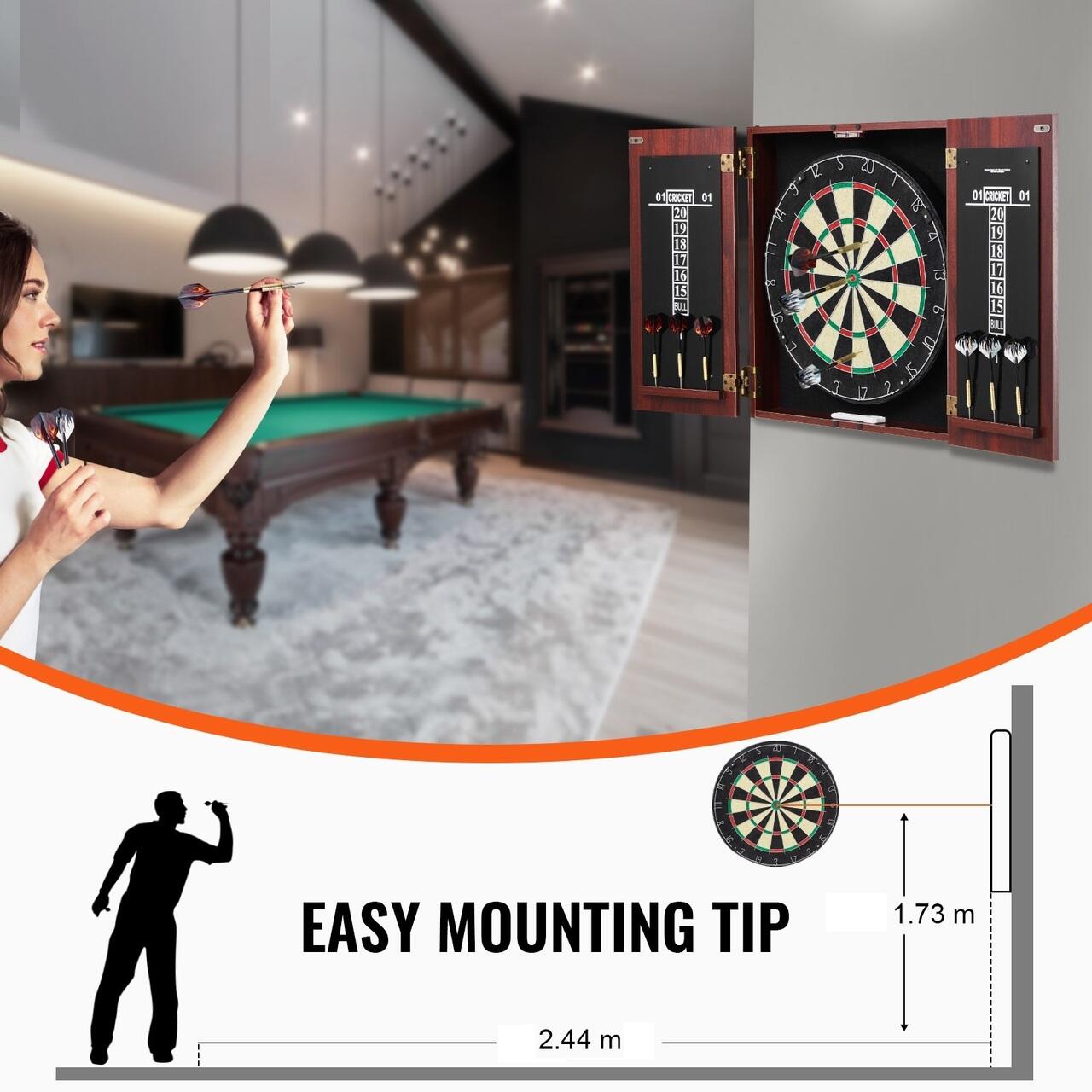 Dartboard cu diametrul de 18 inchi: Echipat cu un diametru de 18 inchi fabricat din fibra de sisal cu auto-vindecare, acest set de darts si dulap este proiectat pentru durabilitate si utilizare prelungita. Materialul de inalta densitate si ochiul fara capse impiedica sagetile sa sara, in timp ce inelul numeric rotativ din otel ajuta la prelungirea duratei de viata a placii.