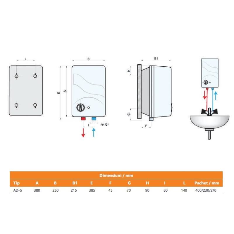 Boiler electric Leov AD-5, 1000 W, 5 L, reglaj extern de temperatura, montare deasupra chiuvetei