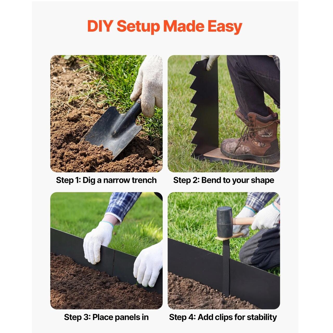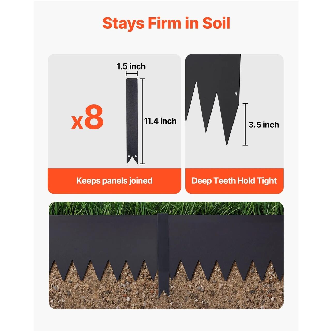 Set complet, gata de utilizare: Acest set de borduri metalice pentru gradina include 6 sectiuni de bordura, 8 cleme si 1 pereche de manusi. Tepoanele extinse aluneca usor in sol, facand instalarea mai usoara si mai placuta.