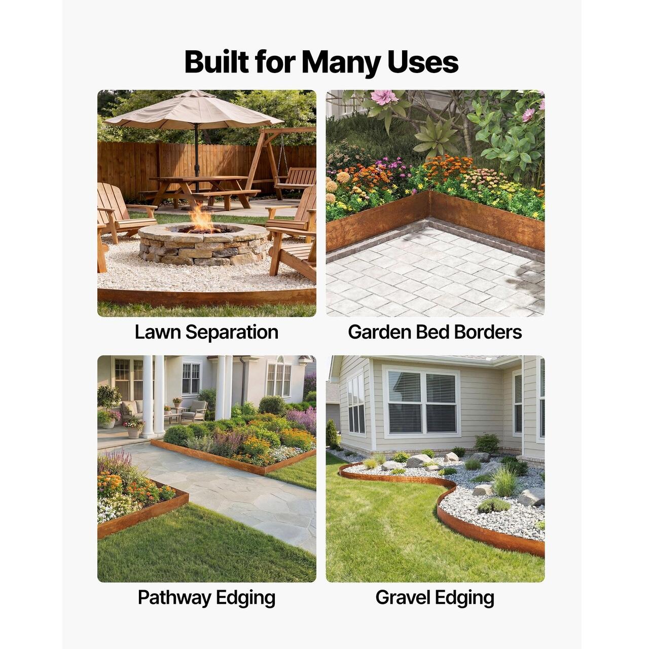 Functioneaza in toate spatiile exterioare: Aceasta bordura metalica pentru curte se potriveste in straturile de flori, aleile si zonele de separare. Designul structurat ajuta la organizarea curtilor, adaugand in acelasi timp un aspect peisagistic elegant si finisat.