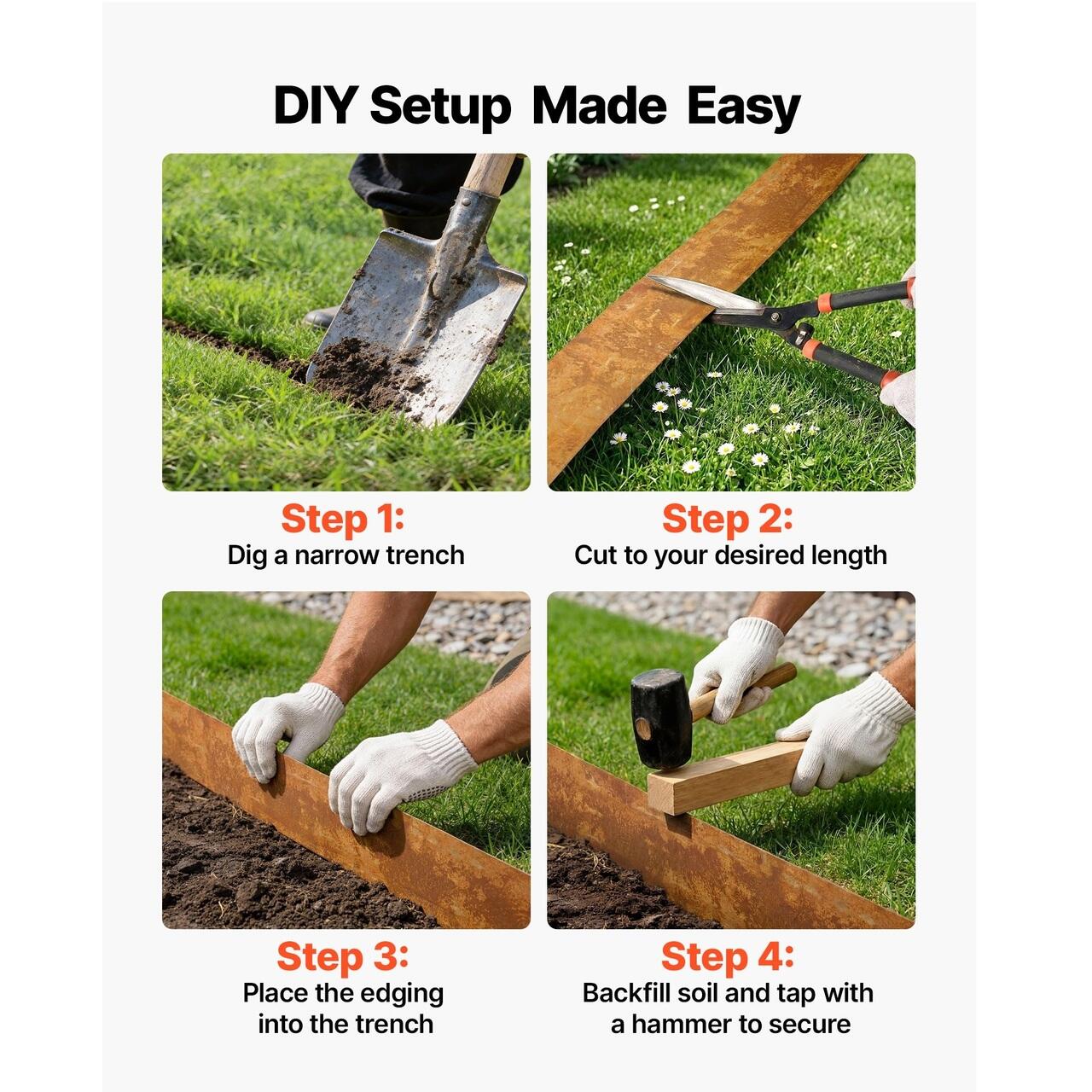 Instalare rapida si simpla: Aceasta bordura de gradina din otel se instaleaza rapid, cu taiere usoara, inserare a pamantului si o lovitura usoara cu ciocanul. Instalarea simpla va tine mainile multumite si permite realizarea bordurilor de gradina fara bataie de cap.