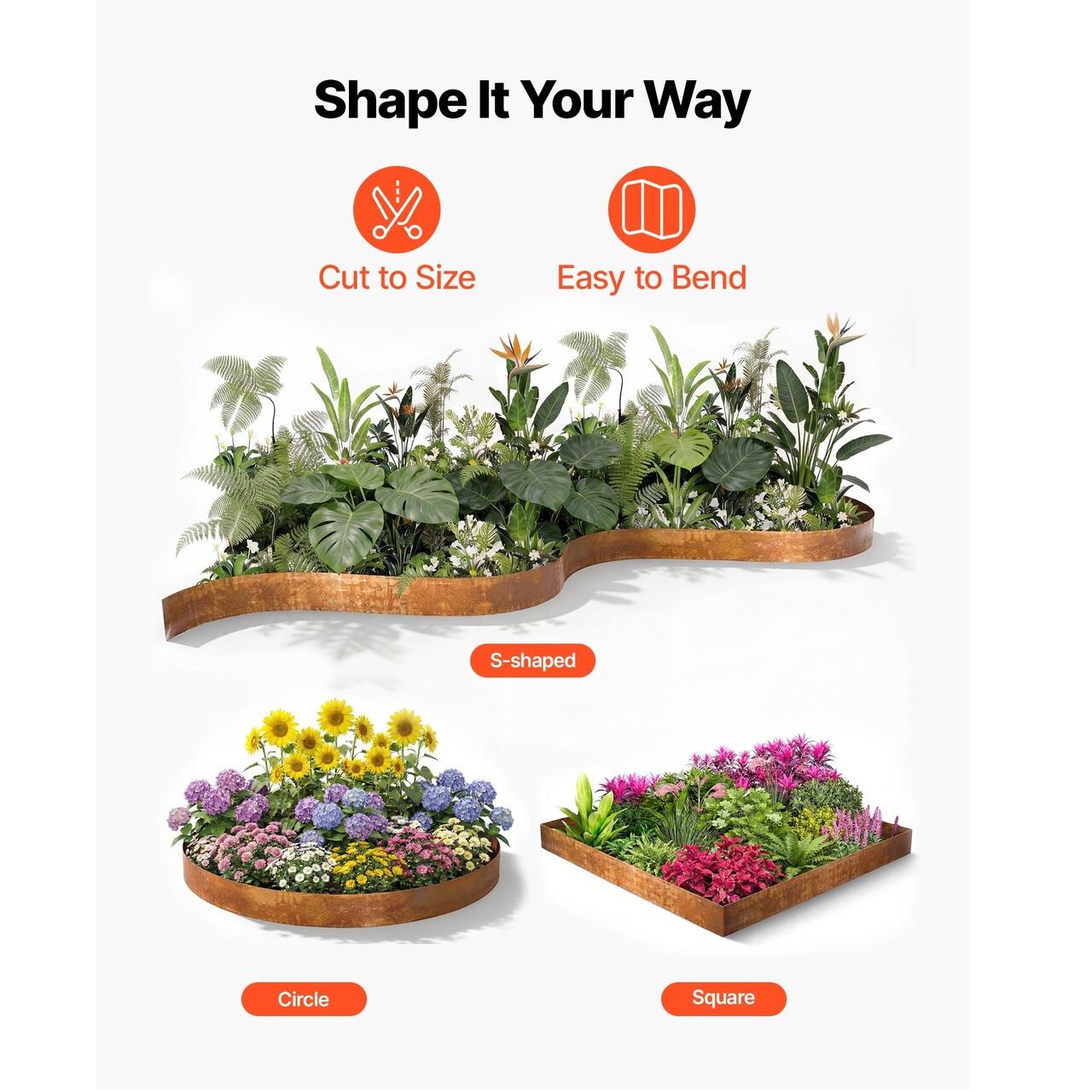 Flexibil si usor de indoit: Aceasta bordura de peisaj din otel se indoaie usor in linii drepte, unghiuri ascutite sau curbe usoare. Designul robust isi pastreaza forma, potrivindu-se in acelasi timp gradinilor carora le place putina creativitate.