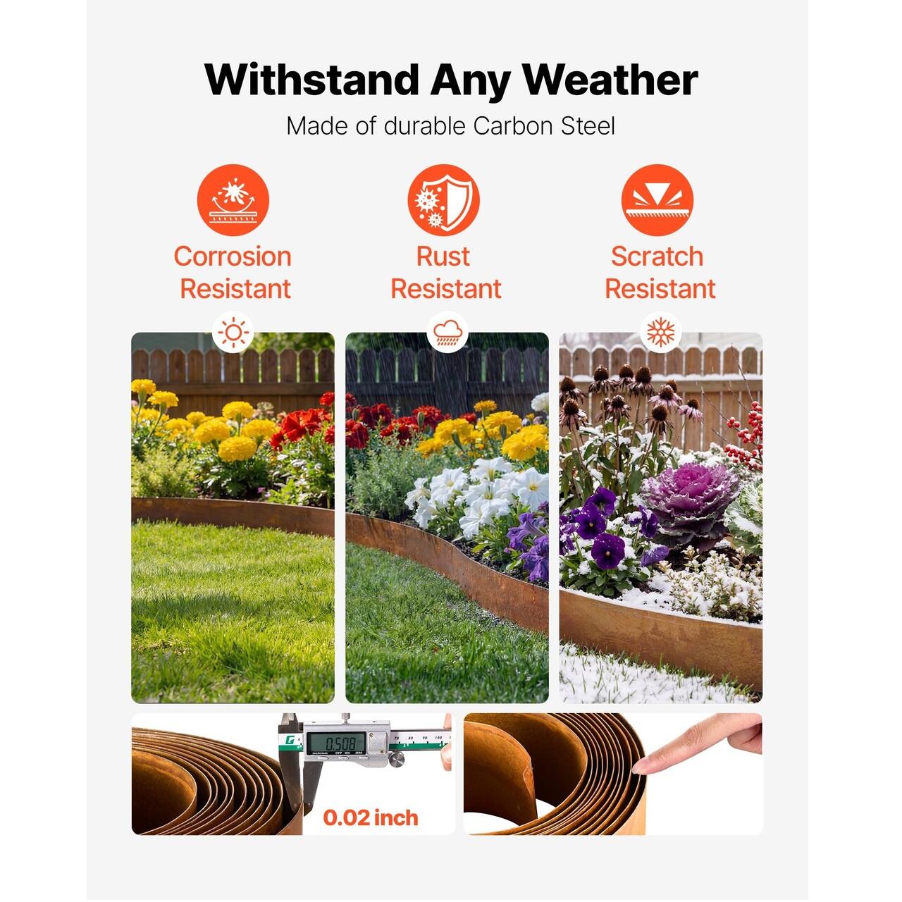 Otel carbon durabil: Aceasta bordura metalica pentru gazon foloseste otel carbon cu o suprafata tratata care ajuta la rezistenta la rugina, decolorare si crapare. Bordurile exterioare raman ingrijite si fiabile in timpul schimbarilor meteorologice de zi cu zi.