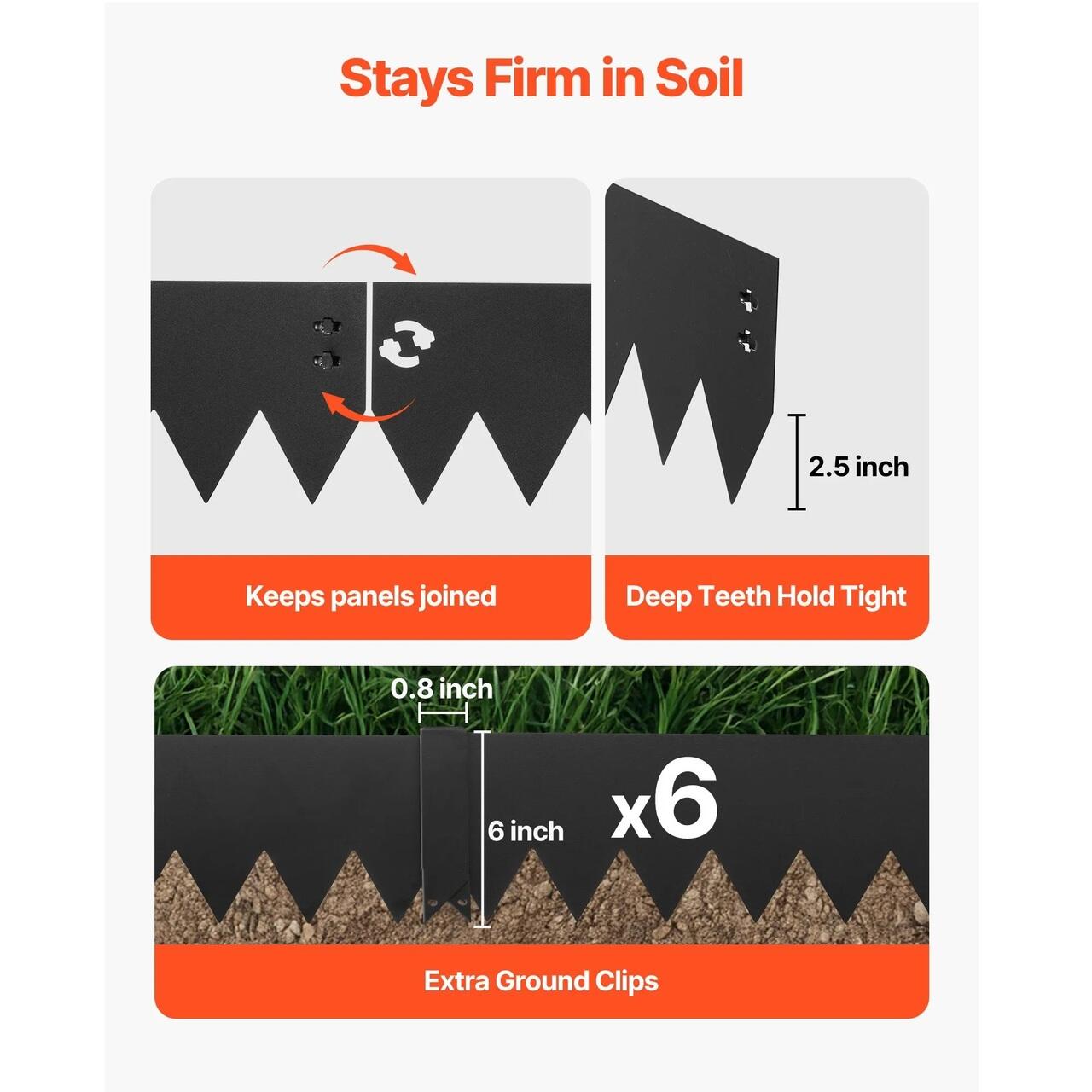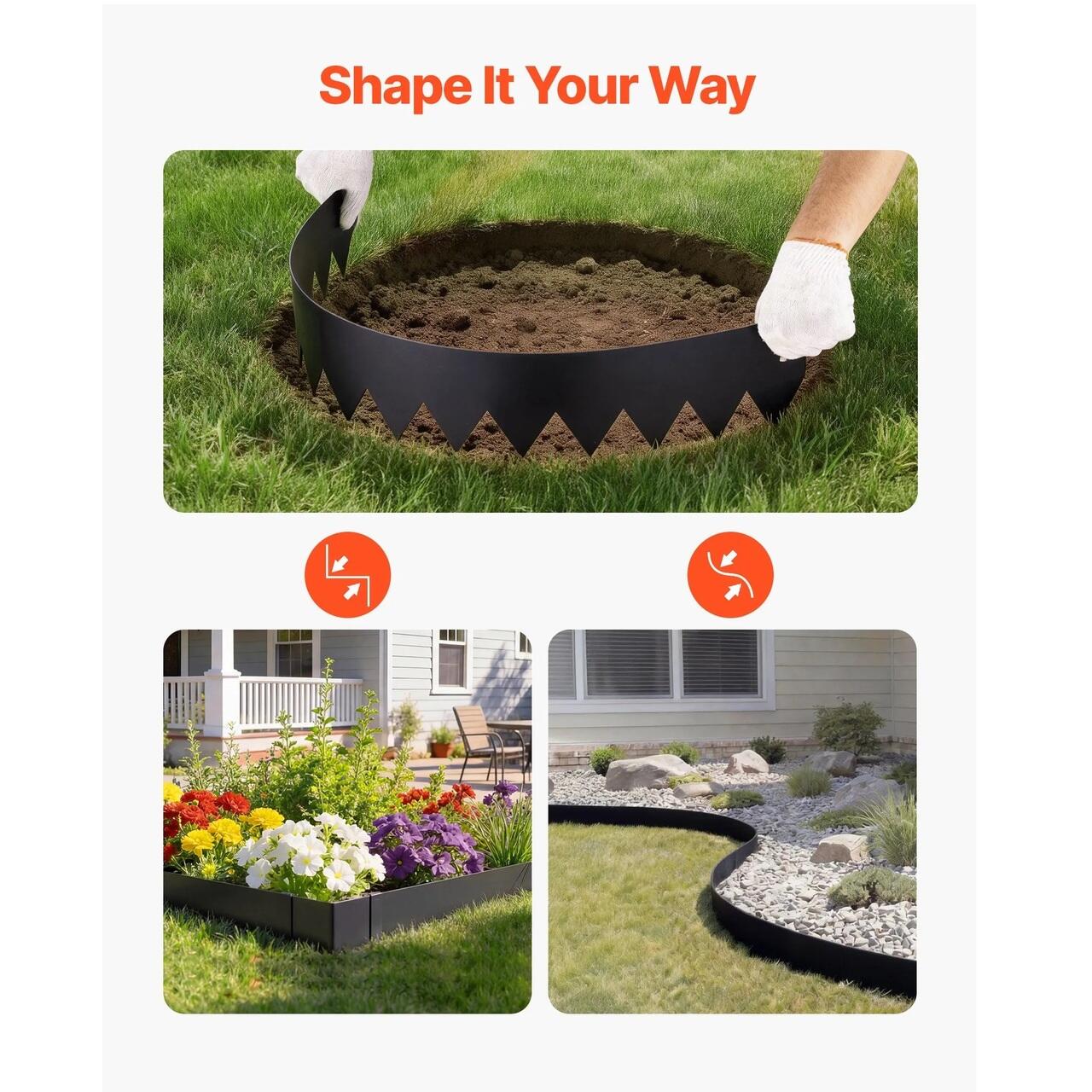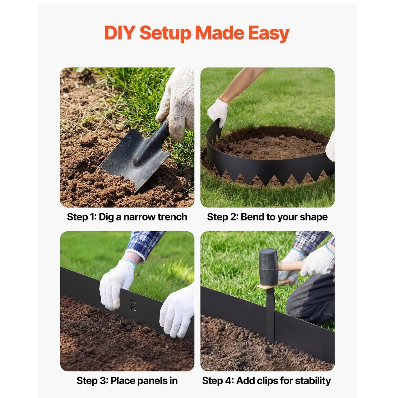 Set complet, gata de utilizare: Acest set de borduri metalice pentru gradina include 6 sectiuni de bordura, 6 cleme si 1 pereche de manusi. Tepoanele extinse aluneca usor in sol, facand instalarea mai usoara si mai placuta.