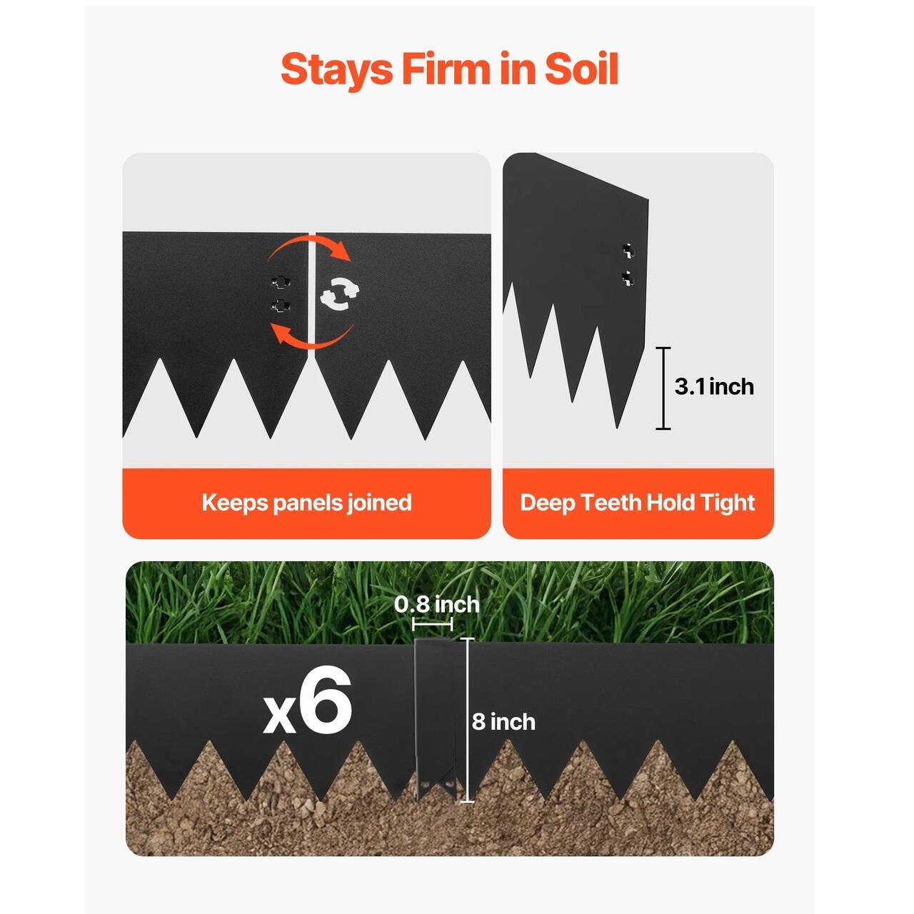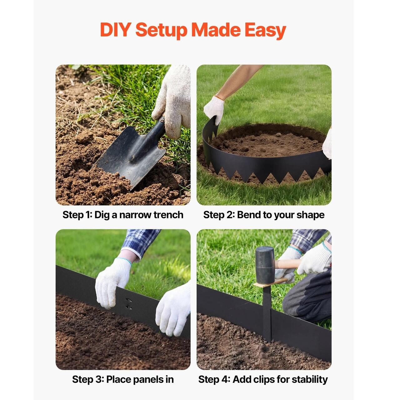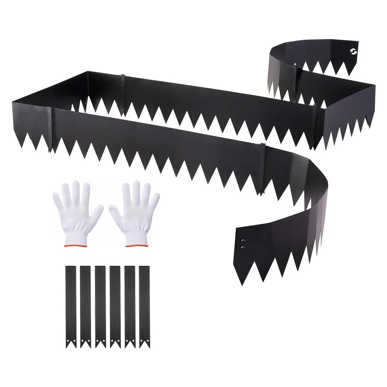 Set complet, gata de utilizare: Acest set de borduri metalice pentru gradina include 6 sectiuni de bordura, 6 cleme si 1 pereche de manusi. Tepoanele extinse aluneca usor in sol, facand instalarea mai usoara si mai placuta.