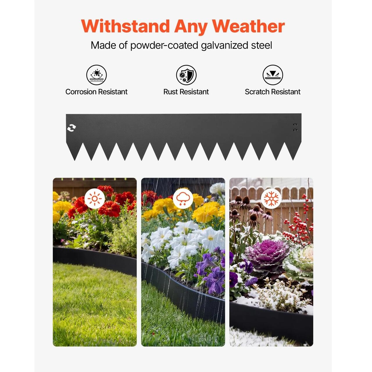 Otel galvanizat durabil: Aceasta bordura metalica pentru gazon foloseste otel galvanizat cu o suprafata tratata care ajuta la rezistenta la rugina, decolorare si crapare. Bordurile exterioare raman ingrijite si fiabile in timpul schimbarilor meteorologice de zi cu zi.