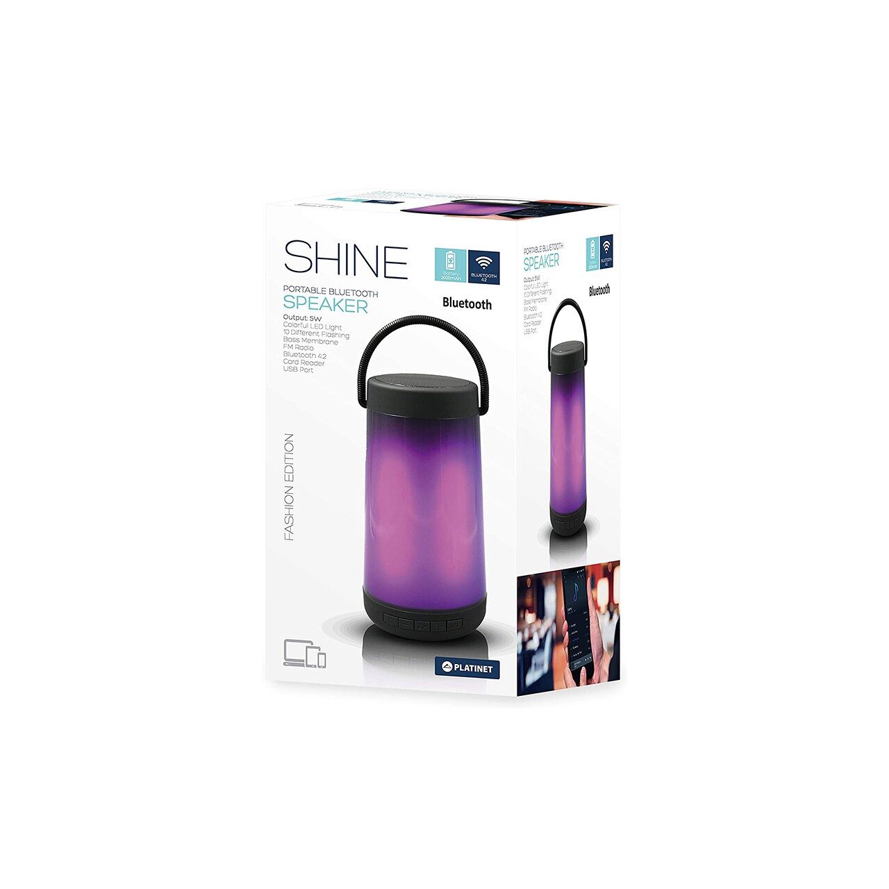 Difuzor wireless cu iluminare de fundal colorată cu LED și mâner pentru transport. Aspectul său unic îl face un decor excelent acasă și în aer liber. Pe lângă funcția de redare fără fir a muzicii de pe dispozitive mobile (tehnologia Bluetooth 4.2 cu EDR), a fost echipat și cu un card de memorie și conector USB, astfel încât să puteți reda melodiile preferate direct de pe dispozitivul de memorie. Utilizatorul are, de asemenea, un tuner radio FM încorporat și un conector AUX pentru redarea muzicii prin cablu. O mulțime de posibilități într-un singur dispozitiv ușor si fiabil! Dispozitivul are un difuzor încorporat de 5 W. Datorită acestui fapt, sunetul reprodus este puternic, clar și în același timp îmbogățit cu bas puternic. Sunetul îmbogățit cu efecte de lumină face o impresie și mai mare. Difuzorul SHINE are până la 10 variante de iluminare diferite, astfel încât să vă surprindeți întotdeauna cu ceva nou. Difuzorul este echipat cu un mâner care permite transportul comod. Designul estetic în combinație cu iluminarea din spate cu LED-uri multicolore îl face nu numai un gadget funcțional, ci și un element interesant al designului interior. SPECIFICATII TEHNICE Difuzor de 5W Bluetooth v4.2 + EDR Autonomie de până la 10m Slot pentru card de memorie și port USB Baterie încorporată 2000mAh / 3.7V Timp de încărcare: 3 ore Timp de redare: până la 5 ore Dimensiuni (mm): 185 x 97 x 97 Greutate: 495 g