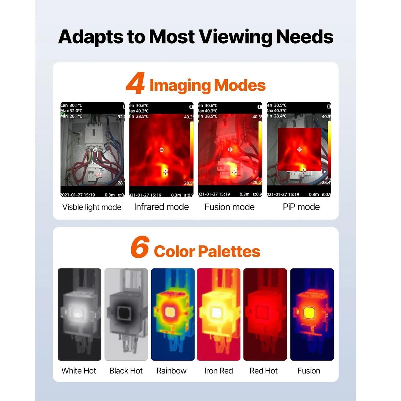 Masurare precisa a temperaturii: Aceasta camera cu infrarosu accepta o gama larga de temperaturi de la -20℃ la 550℃. Urmareste automat punctele calde si reci si afiseaza datele privind temperatura centrala, maxima si minima. Cu 4 moduri de culoare termica si 6 optiuni de paleta, se adapteaza la diferite nevoi de lucru, oferind imagini mai intuitive si mai clare.