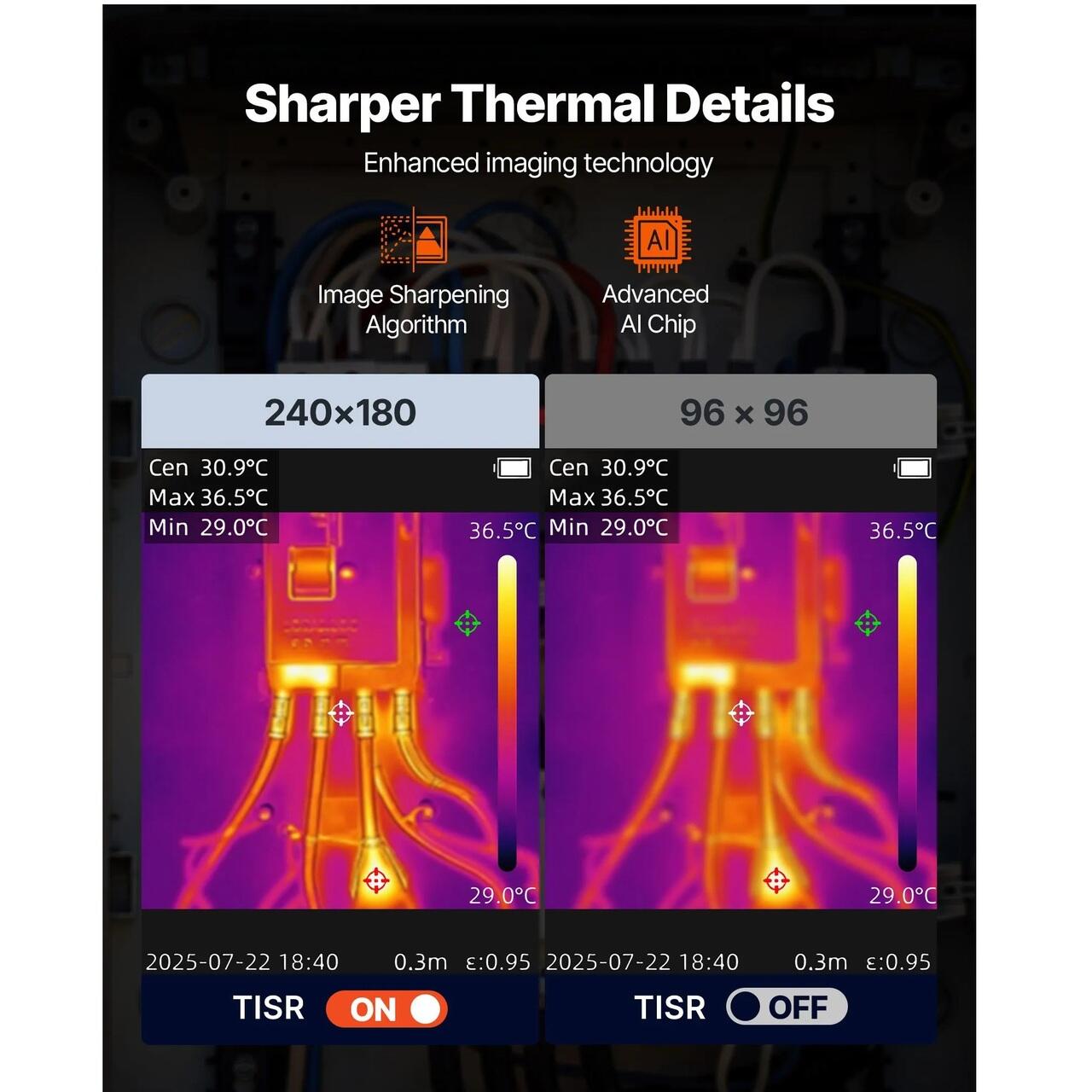 Tehnologie de imbunatatire a imaginii: Camera de termoviziune adopta tehnologia de imbunatatire TISR, imbunatatind rezolutia IR originala de 96x96 la o super-rezolutie de 240x180. Cu o rata de reimprospatare de 25Hz, o sensibilitate termica ≤60 mK si un camp vizual larg de 50.0°(H)x50°(V) / 72.1°(D), combinate cu algoritmi de clarificare a imaginii si un cip AI de inalta performanta, ecranul LCD de 2.4 inch captureaza si afiseaza detaliile termice cu o claritate mai mare.