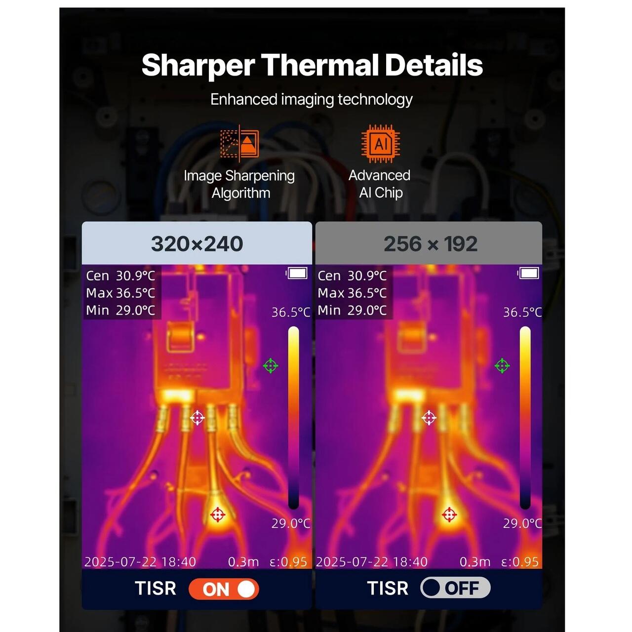 Tehnologie de imbunatatire a imaginii: Camera de termoviziune adopta tehnologia de imbunatatire TISR, modernizand rezolutia IR originala de 256x192 la o super-rezolutie de 320x240. Cu o rata de reimprospatare de 25Hz, o sensibilitate termica ≤40 mK si un camp vizual larg de 50°x37,2°, combinate cu algoritmi de clarificare a imaginii si un cip AI de inalta performanta, ecranul LCD de 2,8 inci captureaza si afiseaza detaliile termice cu o claritate mai mare.