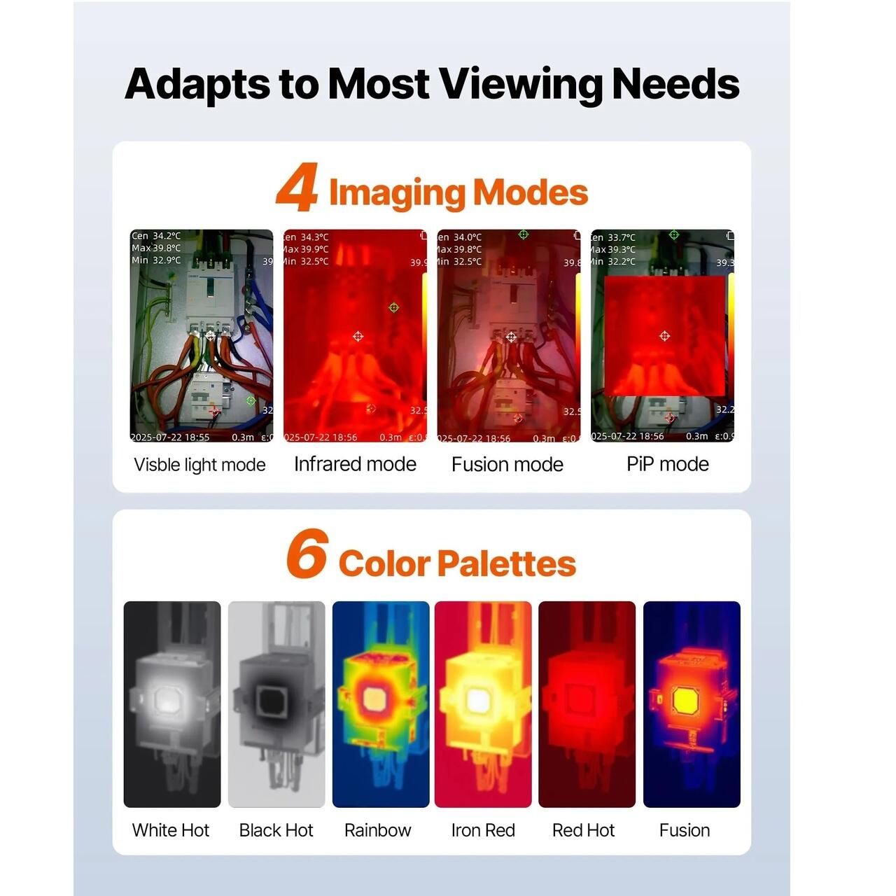 Masurare precisa a temperaturii: Aceasta camera cu infrarosu accepta o gama larga de temperaturi de la -20℃ la 550℃. Urmareste automat punctele calde si reci si afiseaza datele privind temperatura centrala, maxima si minima. Cu 4 moduri de culoare termica si 6 optiuni de paleta, se adapteaza la diferite nevoi de lucru, oferind imagini mai intuitive si mai clare.
