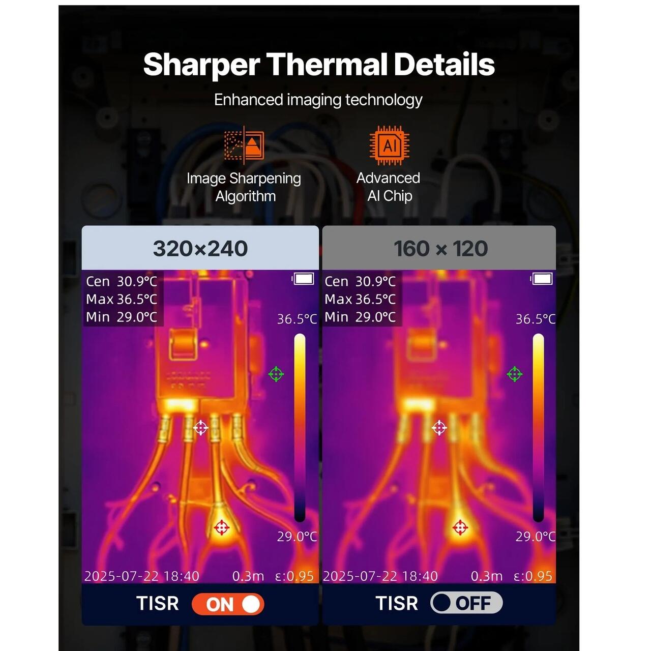 Tehnologie de imbunatatire a imaginii: Camera de termoviziune adopta tehnologia de imbunatatire TISR, imbunatatind rezolutia IR originala de 160x120 la o super-rezolutie de 320x240. Cu o rata de reimprospatare de 25Hz, o sensibilitate termica ≤40 mK si un camp vizual larg de 50°x37.2°, combinate cu algoritmi de clarificare a imaginii si un cip AI de inalta performanta, ecranul LCD de 2,8 inci captureaza si afiseaza detaliile termice cu o claritate mai mare.
