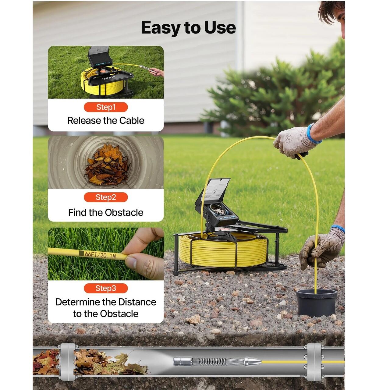 Aplicatii largi: Rola robusta de cablu metalica ofera depozitare convenabila a cablului si transport usor, facand acest instrument de instalatii sanitare ideal pentru sarcini in aer liber, cum ar fi inspectia conductelor piscinei, sistemele de canalizare, intretinerea HVAC etc. Diametre de tevi compatibile: tevi drepte Φ1,18-3,93 in / 30-100 mm; tevi in unghi drept Φ1,97-3,93 in / 50-100 mm