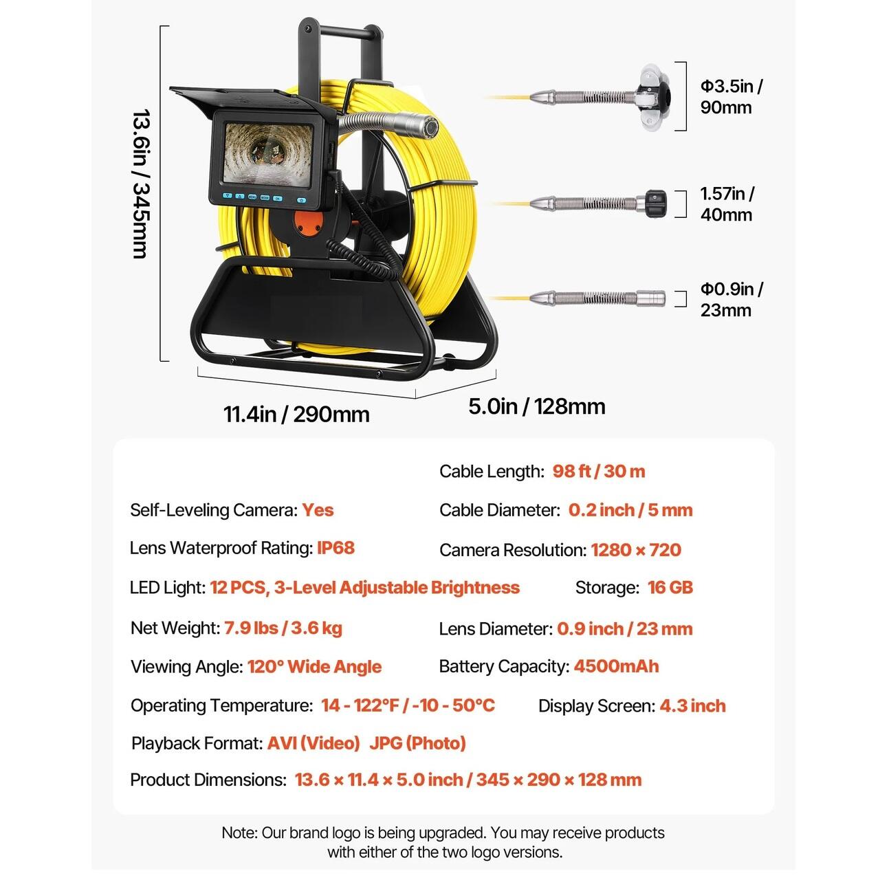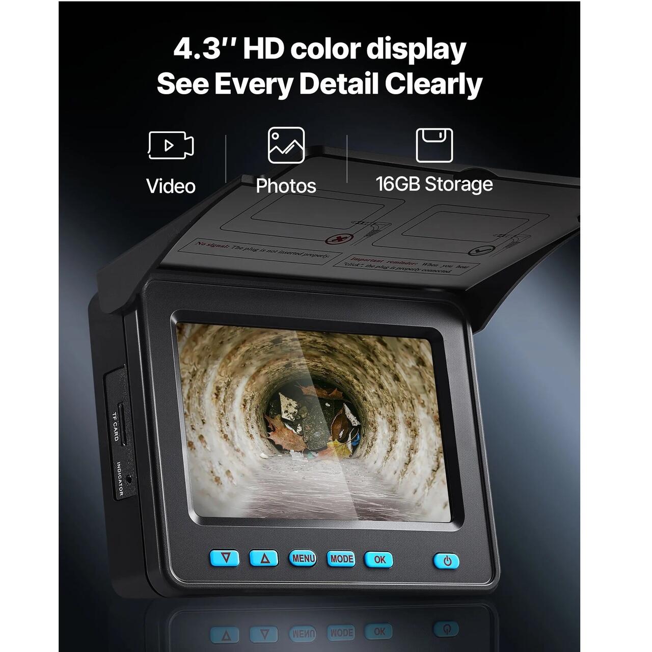 Ecran clar de 4,3 inci: Camera de canalizare dispune de un ecran color de 4,3 inci, oferind imagini clare pentru inspectii detaliate. Accepta inregistrare video si captura de fotografii, cu un card SD de 16 GB inclus pentru stocarea usoara a fotografiilor/videoclipurilor.