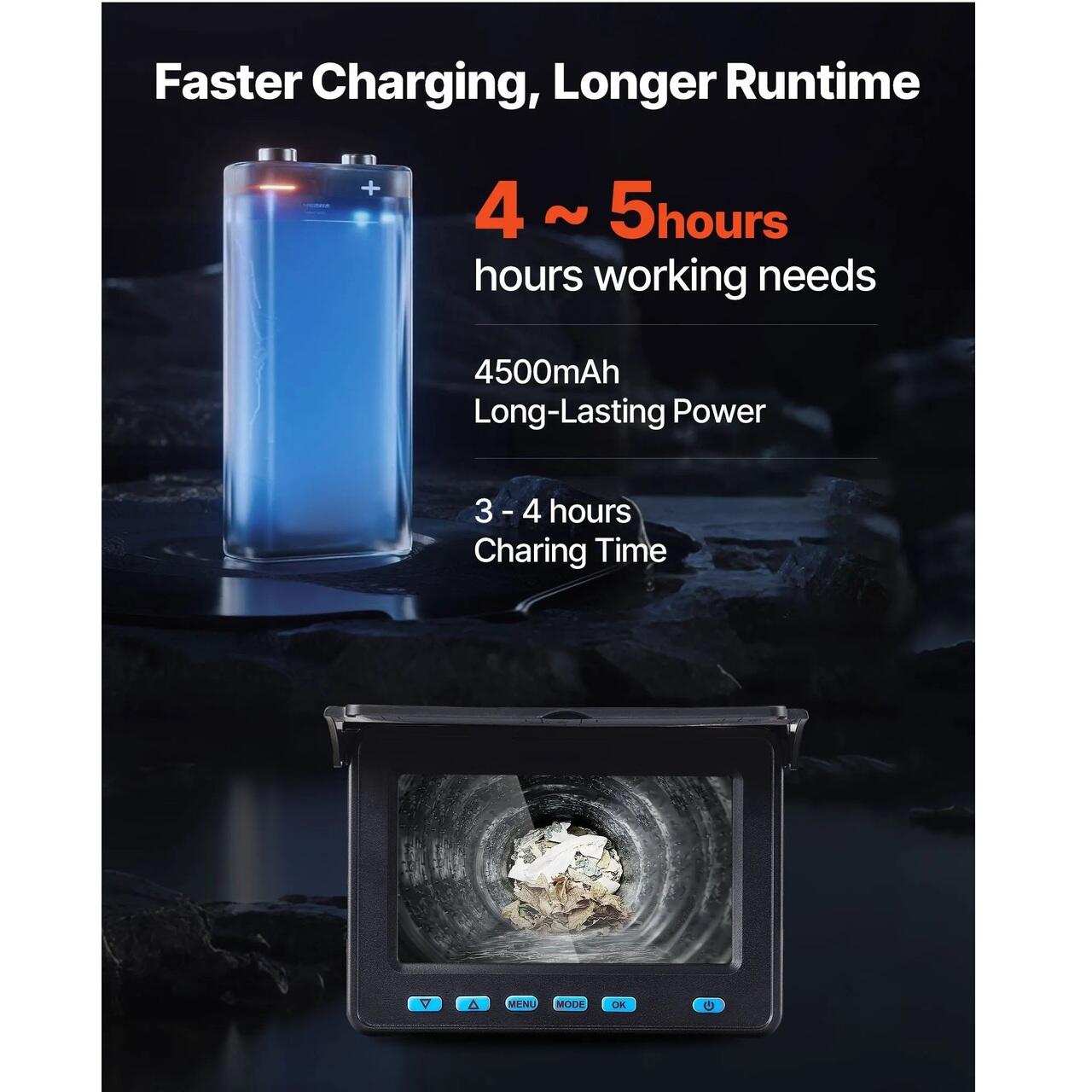 Functioneaza mai mult timp: Aceasta camera video tip sarpe pentru instalatii sanitare este construita cu o baterie reincarcabila de litiu de 4500 mAh care ofera 4-5 ore de utilizare continua. Ideala pentru instalatori, contractori, inspectori, ingineri si lucratori municipali.