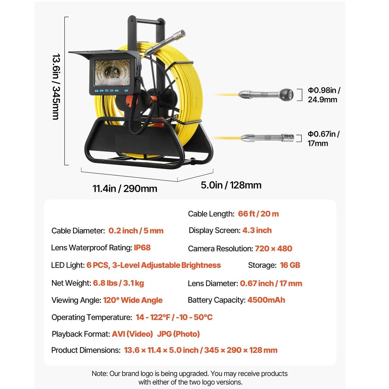 Ecran clar de 4,3 inci: Camera de canalizare dispune de un ecran color de 4,3 inci, oferind imagini clare pentru inspectii detaliate. Accepta inregistrare video si captura de fotografii, cu un card SD de 16 GB inclus pentru stocarea usoara a fotografiilor/videoclipurilor.