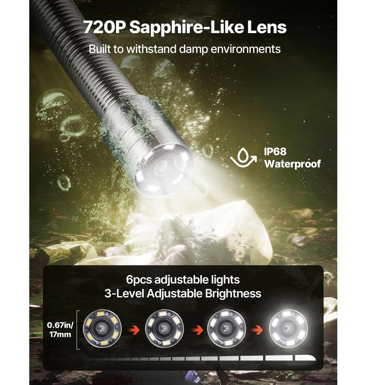 Luminozitate reglabila: Camera noastra de inspectie a tevilor impermeabila IP68 dispune de 6 lumini LED reglabile cu 3 niveluri de ajustare a luminozitatii pentru a se potrivi diverselor conditii de iluminare. Unghiul de vizualizare de 120° ofera un camp vizual larg pentru inspectii complete.