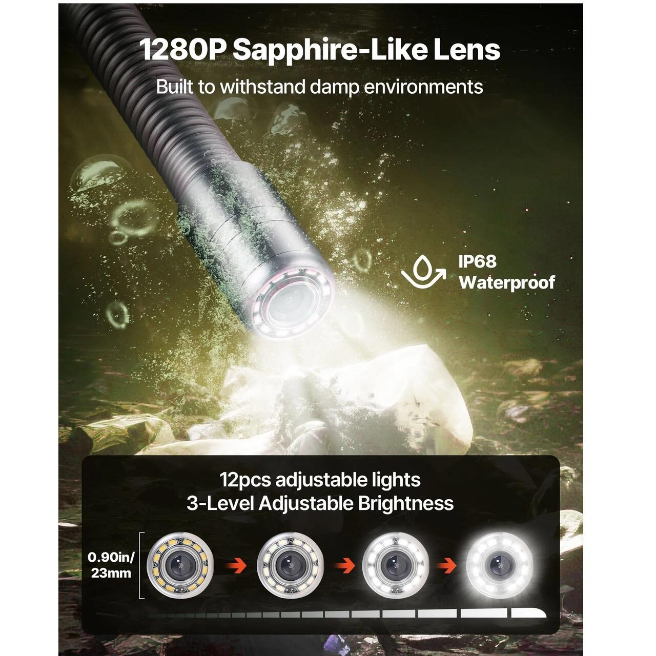 Design optimizat: Camera noastra de supraveghere a instalatiilor sanitare tip sarpe este dotata cu 12 lumini LED reglabile cu 3 niveluri de luminozitate pentru a se potrivi diferitelor conditii de iluminare si o baterie reincarcabila de litiu de 4500 mAh care ofera 4-5 ore de utilizare continua. Ideala pentru instalatori, contractori, inspectori, ingineri si lucratori municipali.