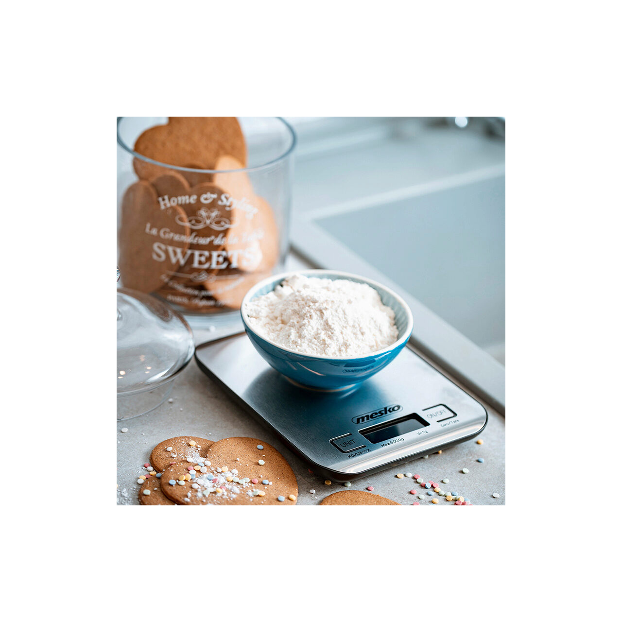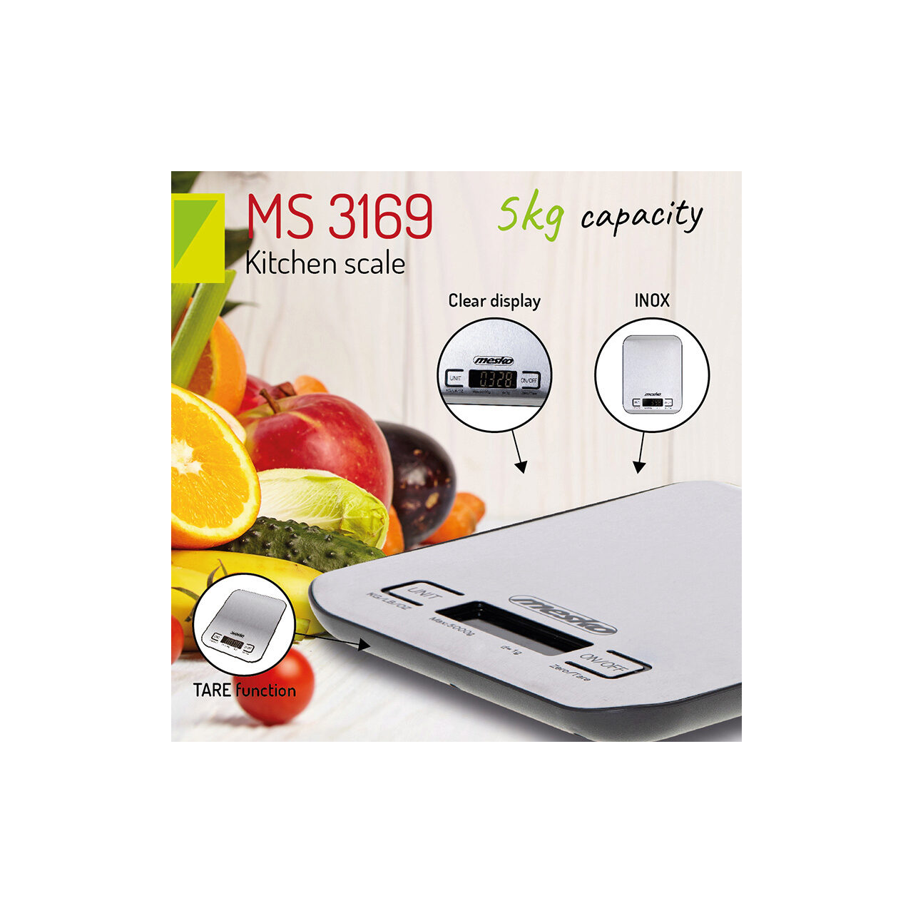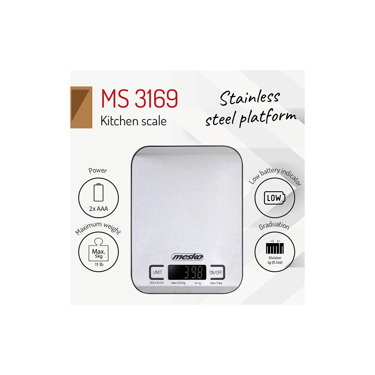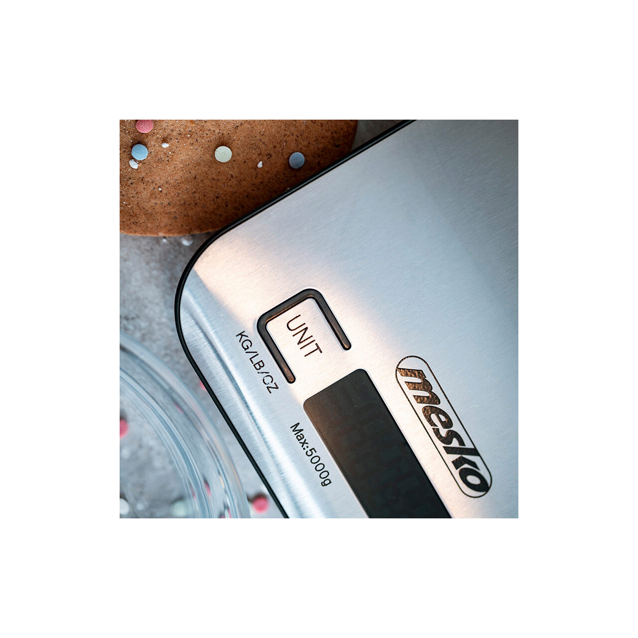Cantar de bucatarie ultra subtire, Mesko Inox, Ecran LCD, 1g-5kg, Baterie 2 x AA