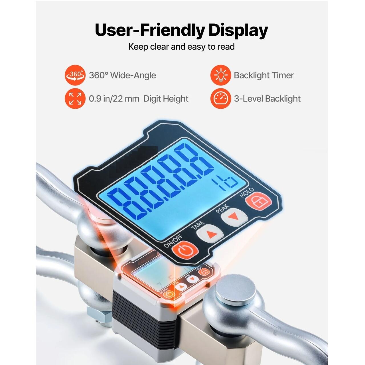 Citire clara oriunde: Acest cantar suspendat ofera un ecran vizibil la 360° pentru citire usoara de la distanta. Trei niveluri de luminozitate si setari de timp va ajuta sa vedeti greutatile sub soare puternic sau in zone cu lumina slaba.