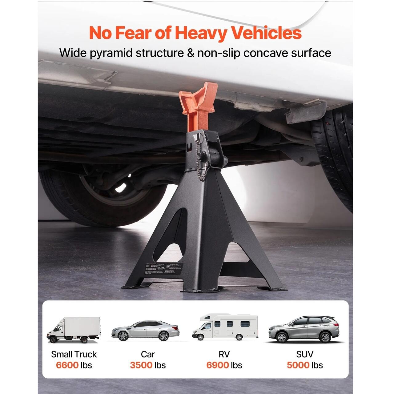 Suport stabil: Avand o baza piramidala lata si suporturi pentru picioare marite, suporturile noastre auto ofera o zona portanta extinsa pentru o stabilitate imbunatatita. Partea superioara crestata a barei cu clichet se fixeaza in siguranta pe punctele de contact ale vehiculului pentru o prindere ferma.