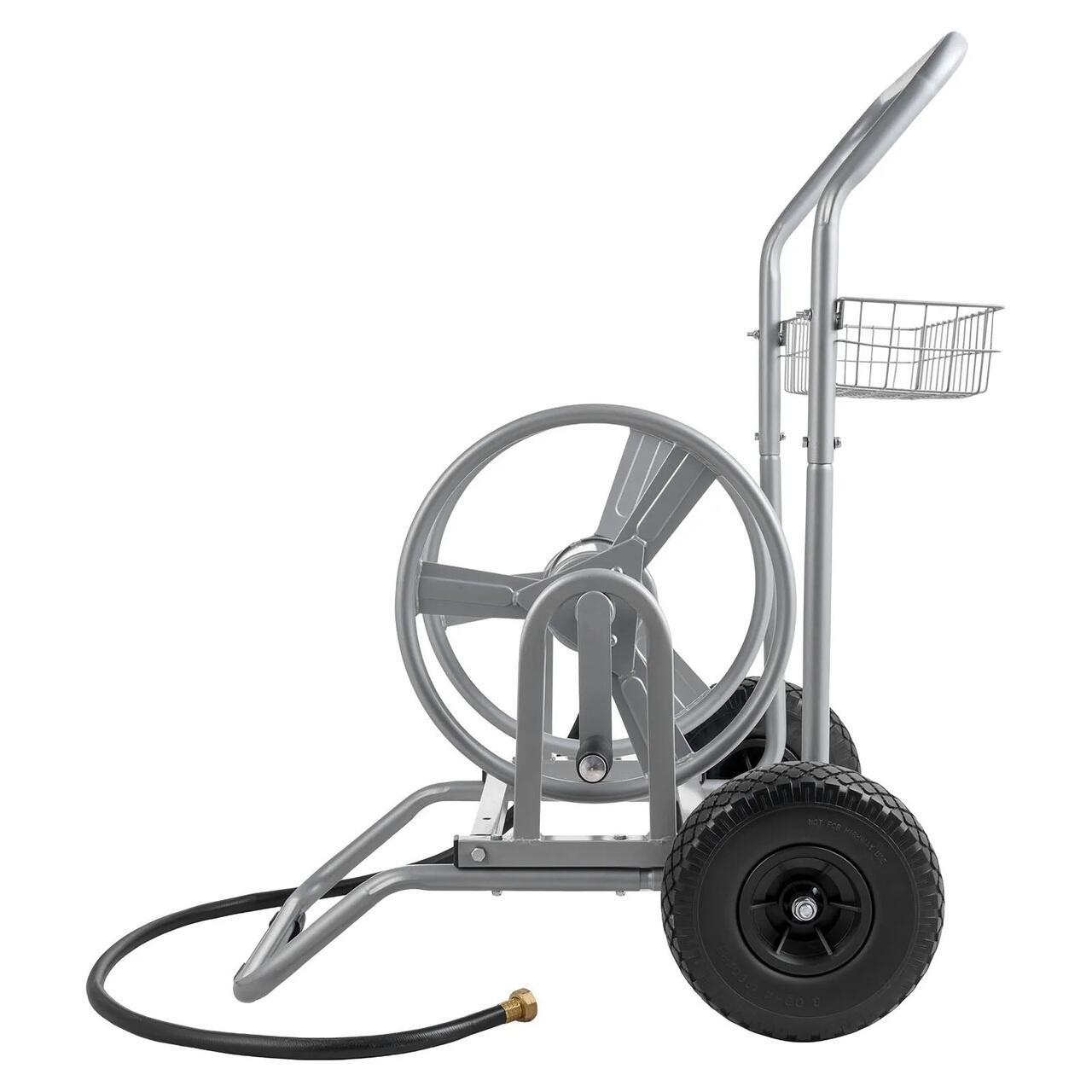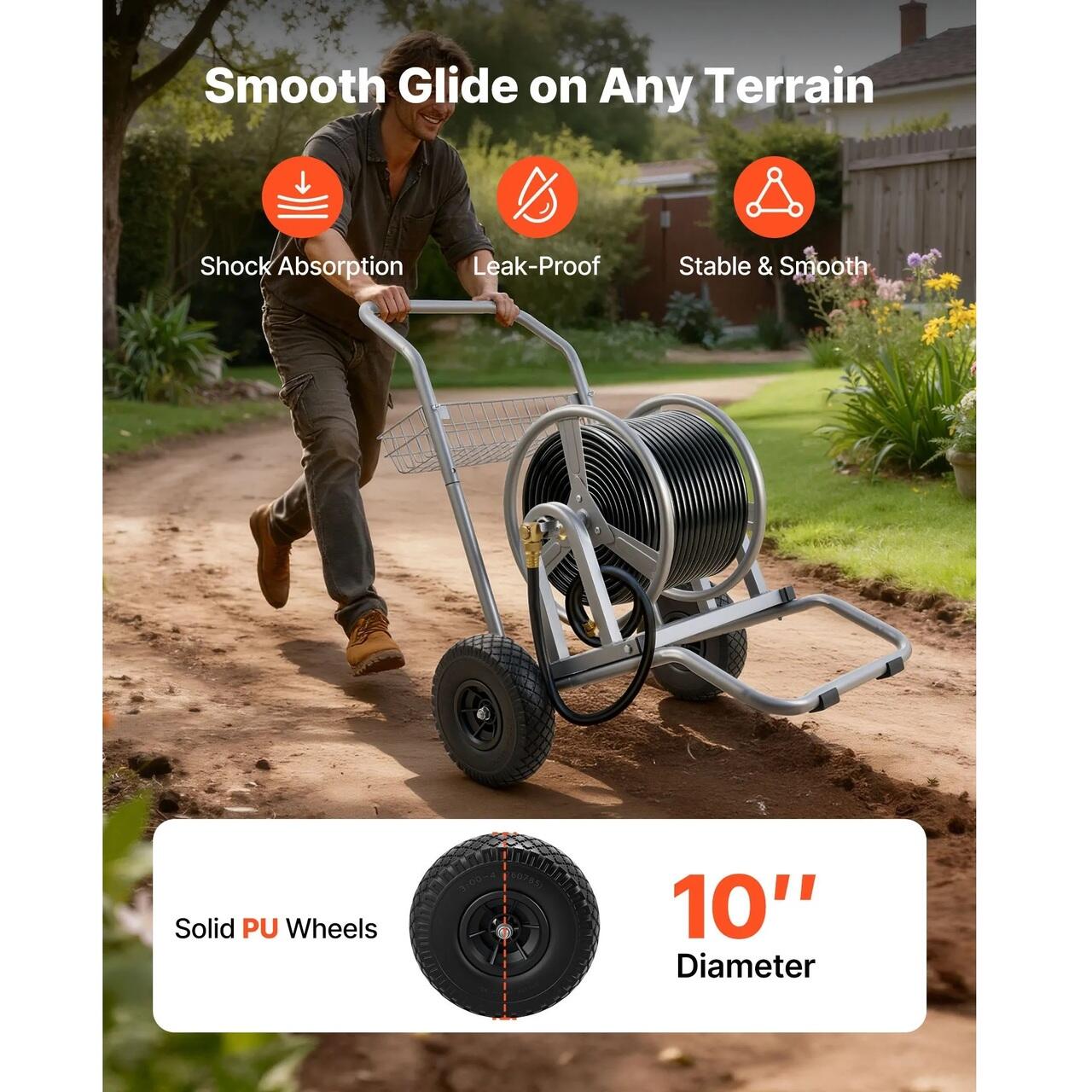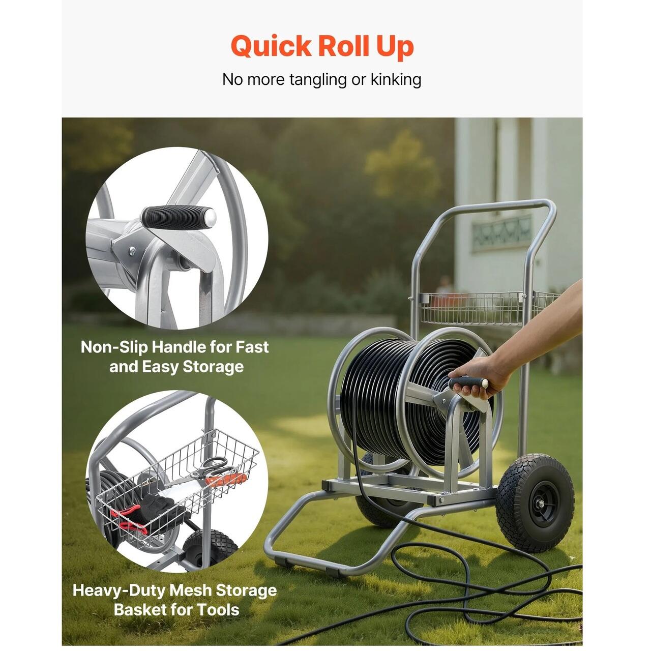 Miscare lina: Proiectat cu roti antiderapante si un cadru cu centru jos, acest carucior pentru furtun de apa cu roata se misca constant pe gazon, pietris si teren accidentat. Constructia durabila asigura stabilitatea sub sarcini grele, permitand transportul usor al furtunurilor fara rasturnare sau efort suplimentar.