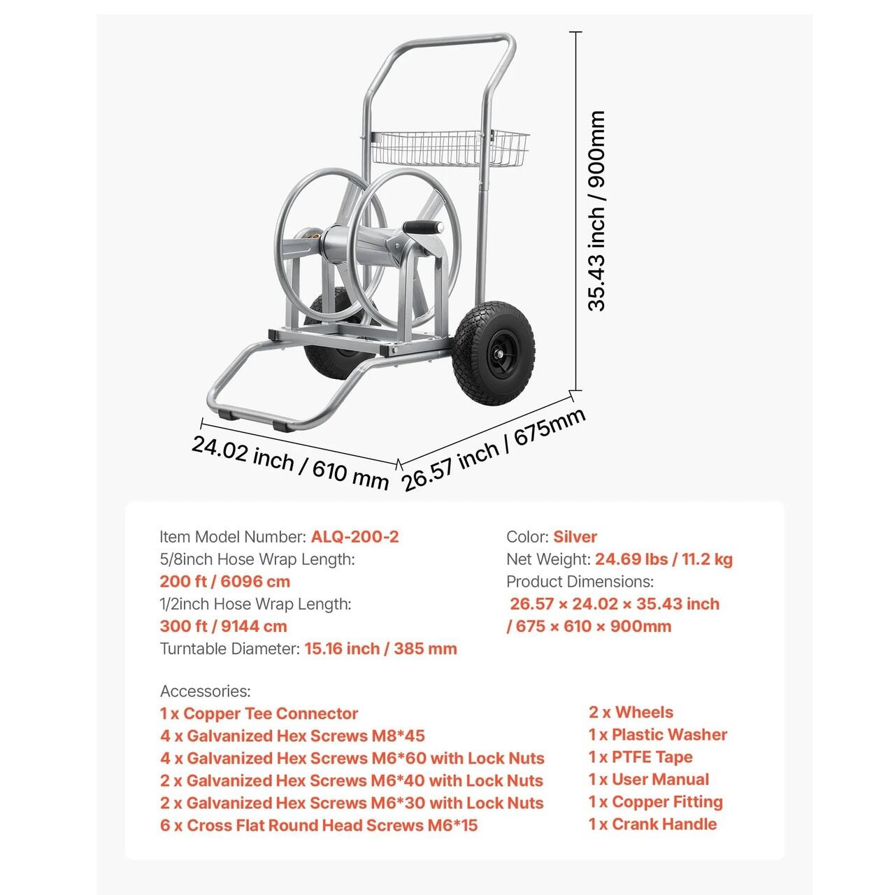 Design cu tambur mare: Acest carucior cu roata pentru furtunuri poate fi utilizat pentru furtunuri de pana la 9144 cm  de 1/2" (12,7 mm) sau 6096 cm de 5/8" (15,88 mm). Tamburul sau largit permite o incarcare mai rapida si o depozitare usoara, eliminand problemele de acces si permitandu-va sa va deplasati usor prin curti sau terase, fara a repozitiona constant furtunul.