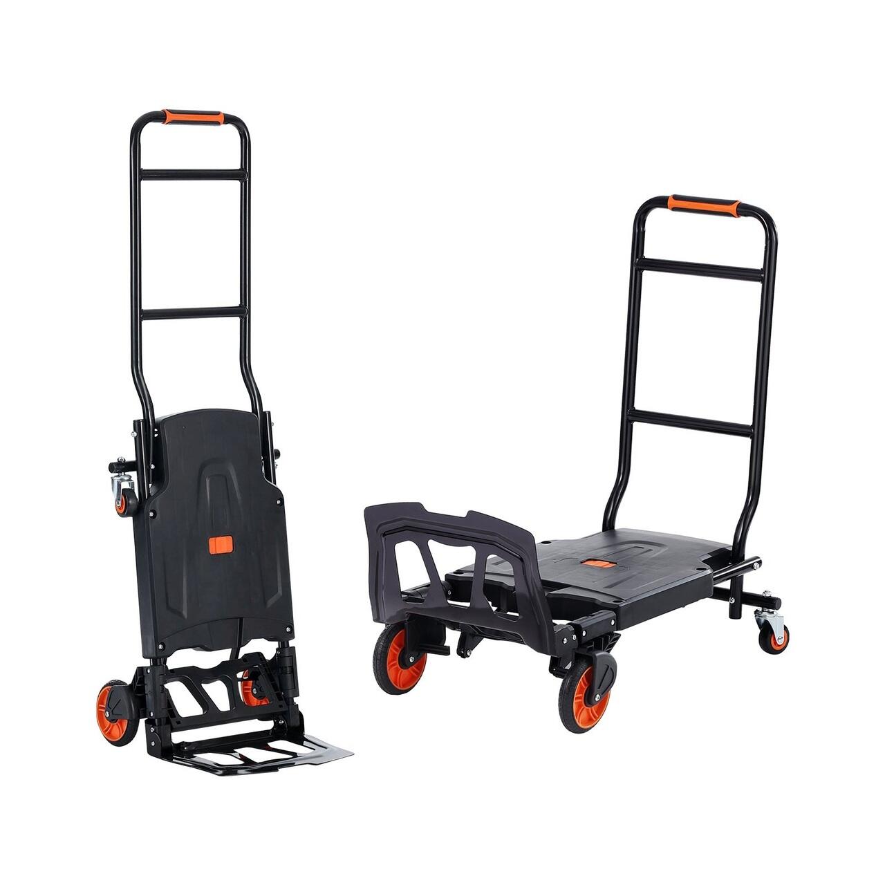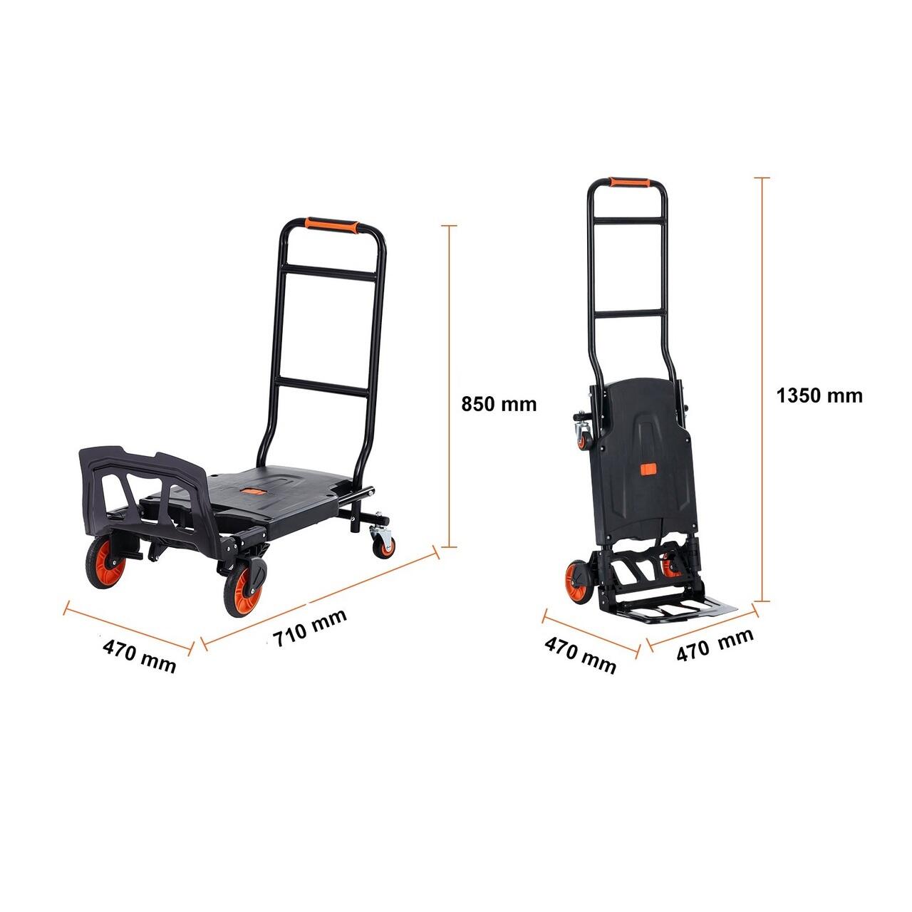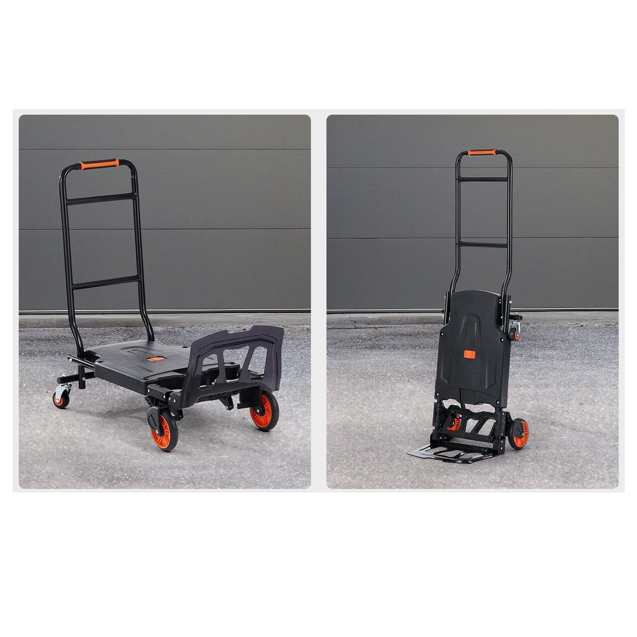 Flexibilitate doua-in-unul: drept in sus sau asezat plat — cum rulati? Acest carucior ergonomic se transforma in doua carucioare diferite in cateva secunde. Ai nevoie de mai multe optiuni de transport? Manerul nostru anti-alunecare te acopera! Alegeti modul care se potriveste cel mai bine nevoilor dvs. de mutare a marfurilor.