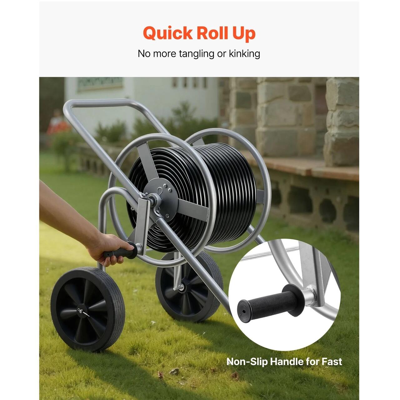 Miscare lina: Proiectat cu roti antiderapante si un cadru cu centru jos, acest carucior pentru furtun de apa cu roata se misca constant pe gazon, pietris si teren accidentat. Constructia durabila asigura stabilitatea sub sarcini grele, permitand transportul usor al furtunurilor fara rasturnare sau efort suplimentar.