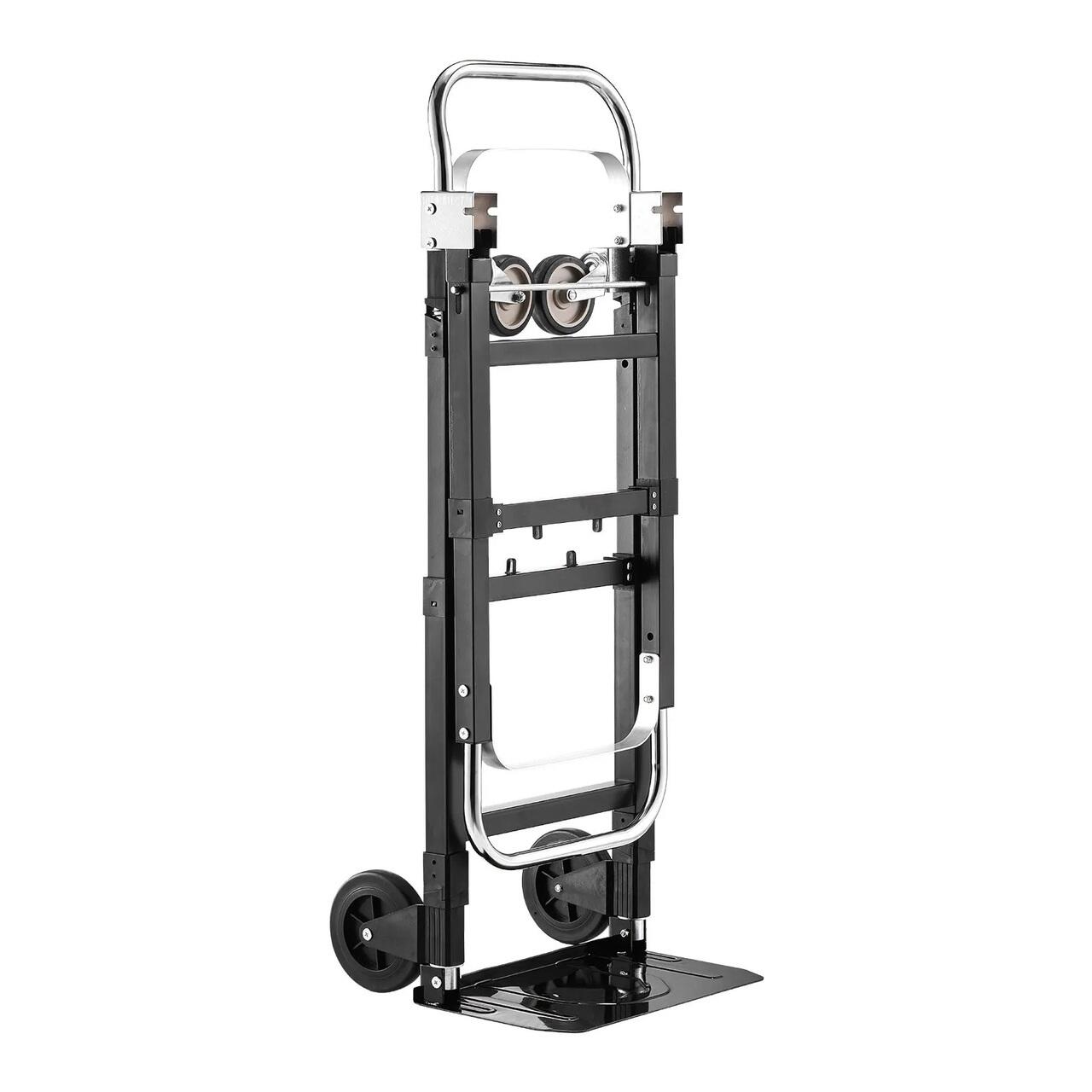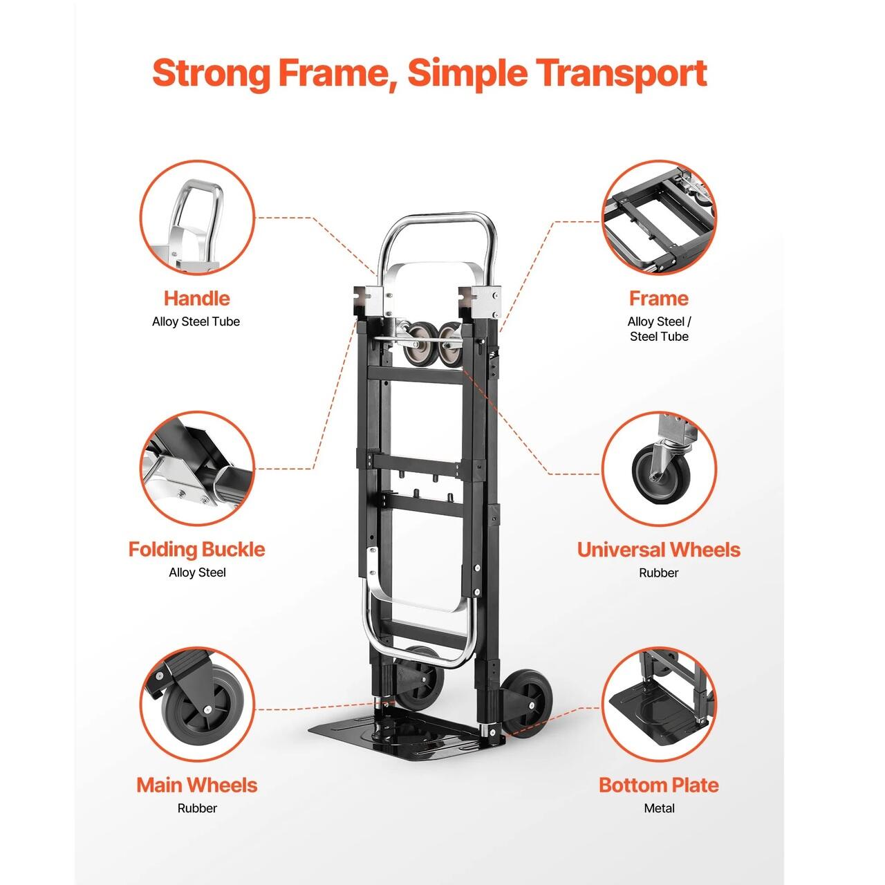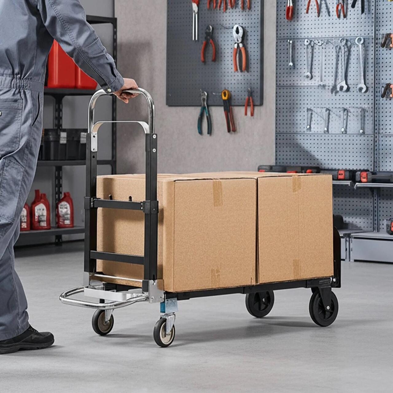 Utilizare flexibila 2 in 1: Acest carucior poate fi folosit ca un carucior vertical cu 2 roti sau ca un camion cu platforma cu 4 roti, permitand schimbarea rapida a modului in cateva secunde. Manerele si baza reglabile se potrivesc cu usurinta diferitelor dimensiuni si inaltimi de incarcatura pentru livrare, mutare sau transport zilnic.