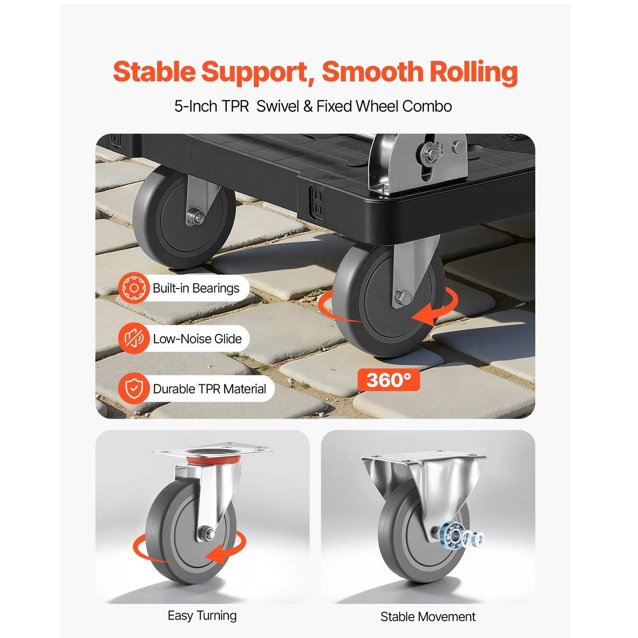 Roti pivotante TPR de 5 inch, rulare silentioasa: Echipat cu roti pivotante TPR montate pe rulmenti de 5 inch si roti fixe, acest carucior pliabil ofera mobilitate la 360° si functionare silentioasa pe podele neuniforme, curbe inguste si suprafete accidentate.