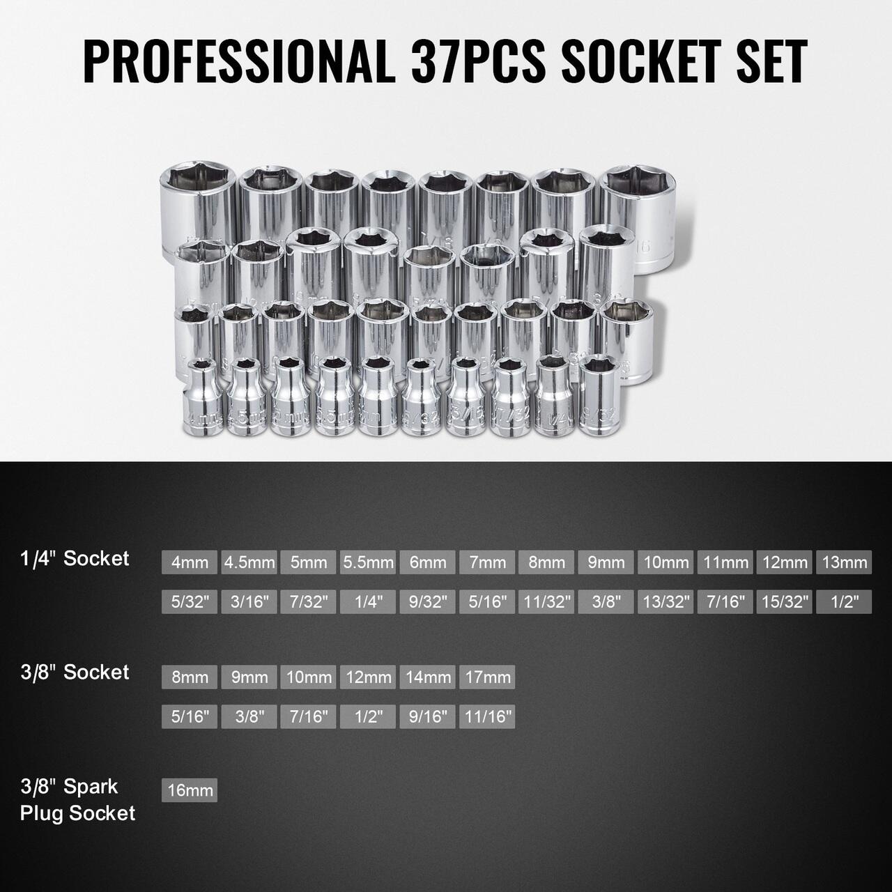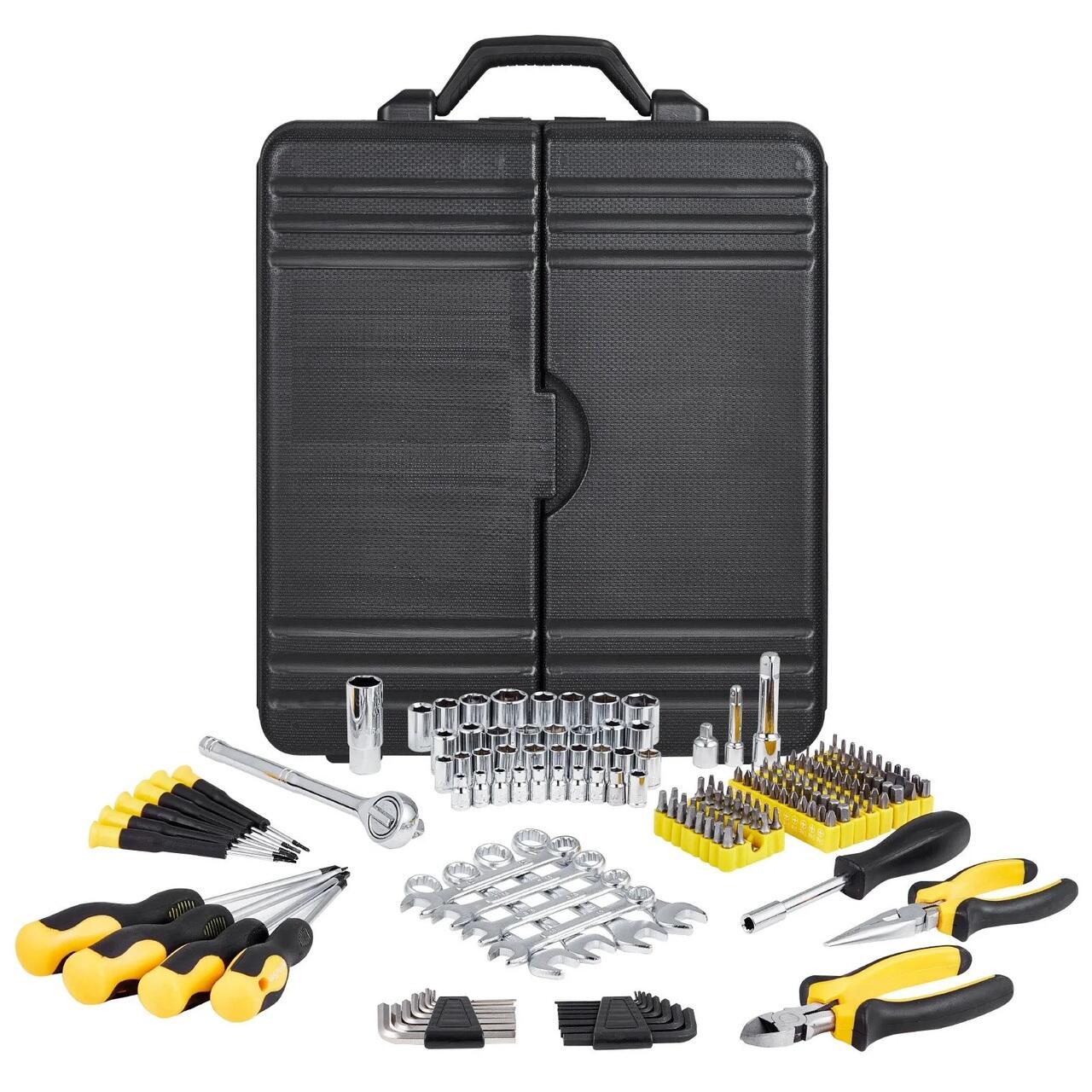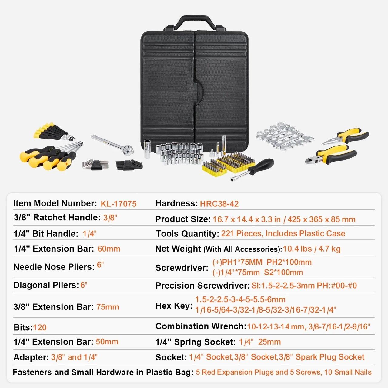 Compatibilitate maxima: Acest set de scule mecanice cu 221 de piese include chei tubulare SAE si metrice de 3/8" si 1/4", manere cu clichet, chei hexagonale, extensii, biti, surubelnite si clesti, fiind perfect pentru reparatii complexe.