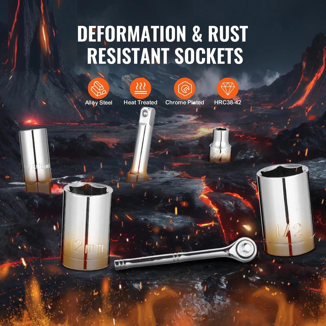 Durabilitate exceptionala: Fabricata din otel aliat de inalta performanta si tratata termic, aceasta trusa de scule mecanice rezista la uzura si deformare chiar si dupa ani de utilizare. Finisajul cromat ofera o rezistenta excelenta la coroziune, asigurand ca sculele pot face fata sarcinilor dificile si mediilor de lucru dure.
