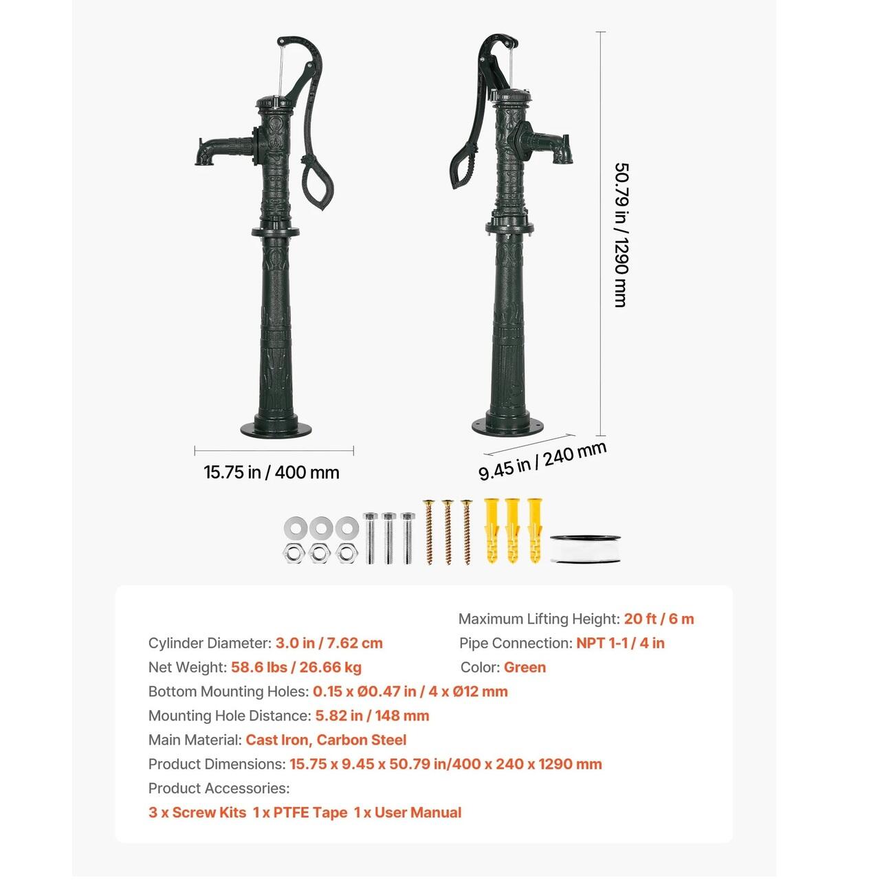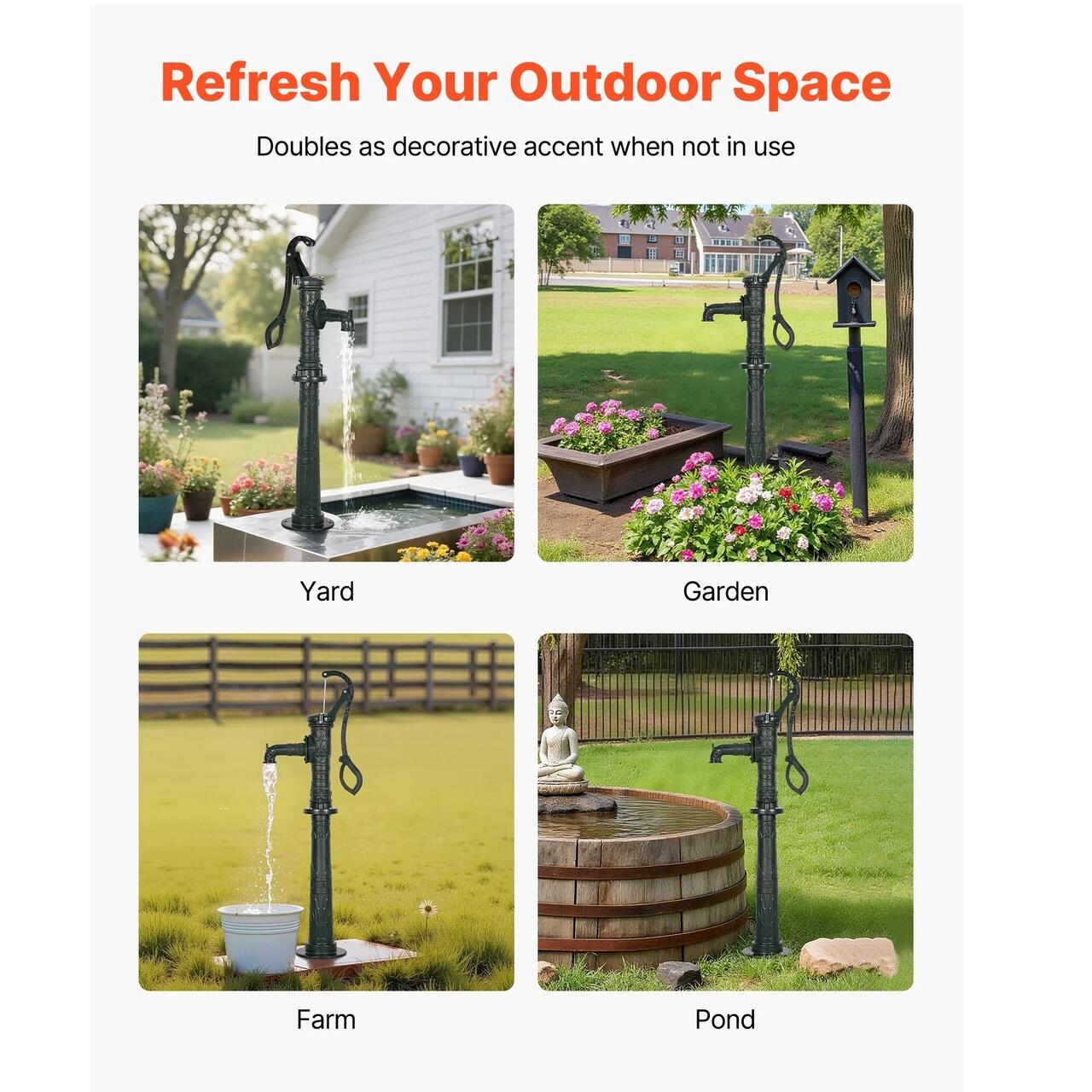 Stil vintage atemporal: Aceasta pompa manuala pentru put are un design retro clasic, ideala pentru pomparea in iazuri, fantani, gradini, locuri de campare, curti, ferme si parcuri. Atat decorativa, cat si practica, serveste ca o frumoasa decoratiune pentru gradina atunci cand nu este utilizata.