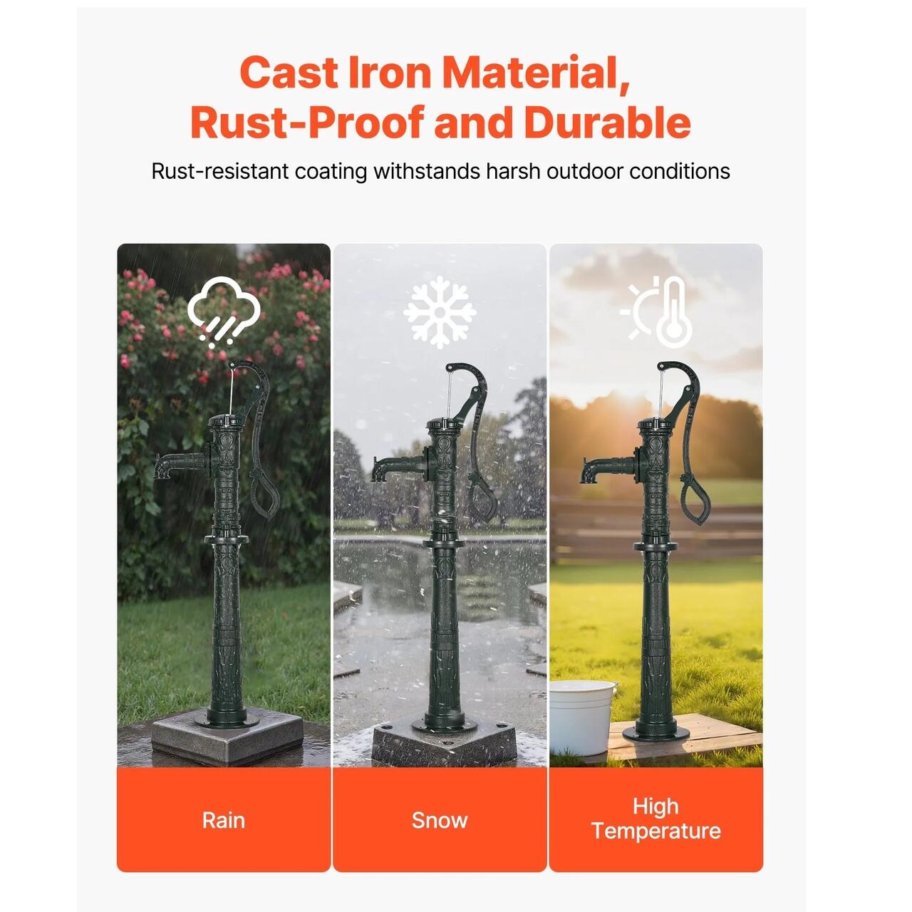 Constructie durabila din fonta: Fabricata din fonta cu un strat rezistent la rugina, pompa noastra de ulcior este construita pentru a rezista. Teava ingrosata poate suporta impacturi de pana la 9 kg, rezistand la conditii exterioare dure, cum ar fi ploaie, zapada, caldura si frig.