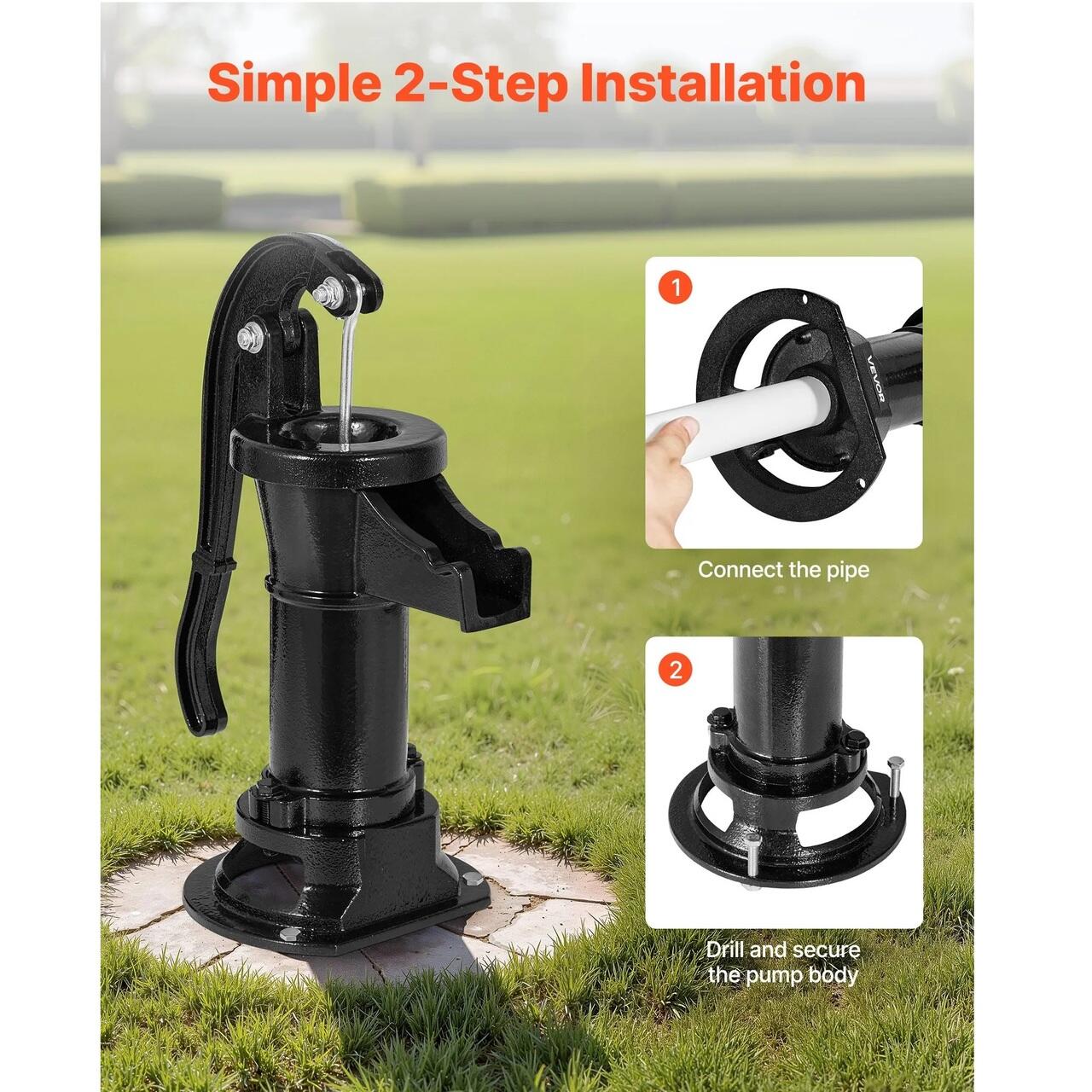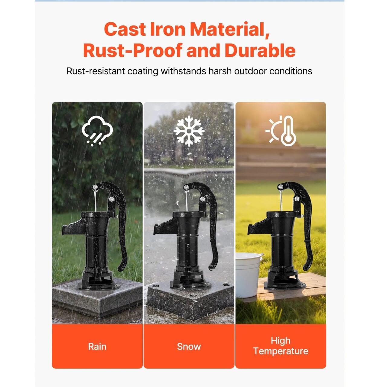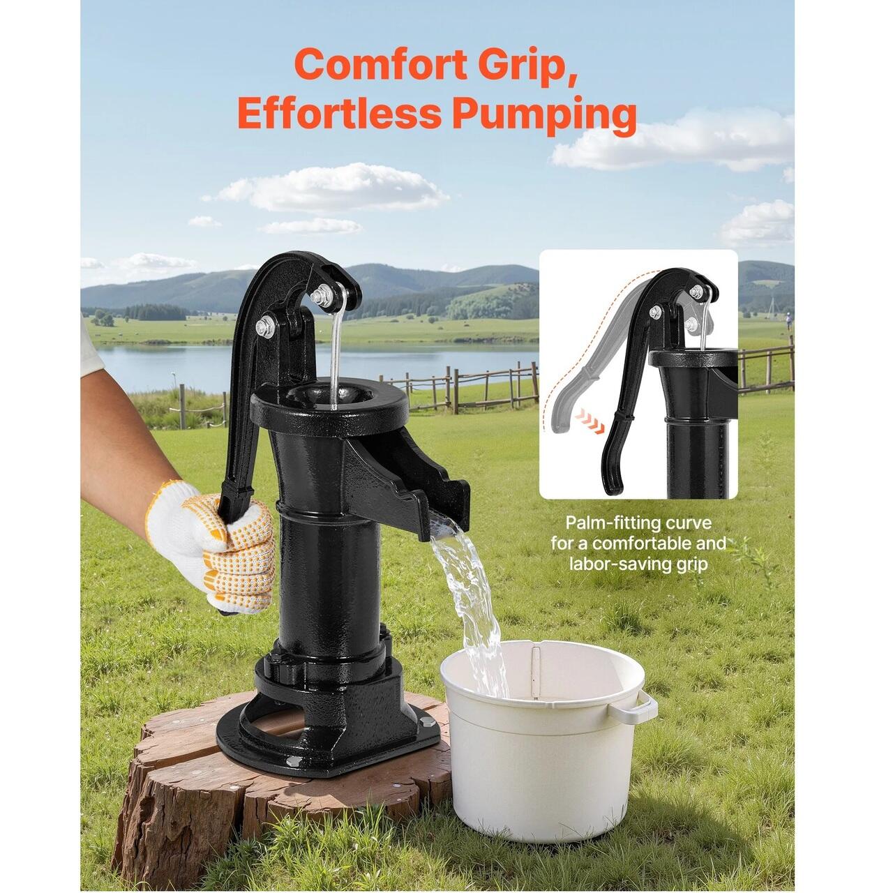 Pompare eficienta a apei: Conceputa pentru puturi putin adanci sau puncte de put, aceasta pompa manuala de apa din fonta ridica apa de la adancimi de pana la 7,6 m. Potrivita pentru majoritatea nivelurilor de apa subterana. Nu necesita electricitate, trebuie doar sa o instalati si sa incepeti pomparea.