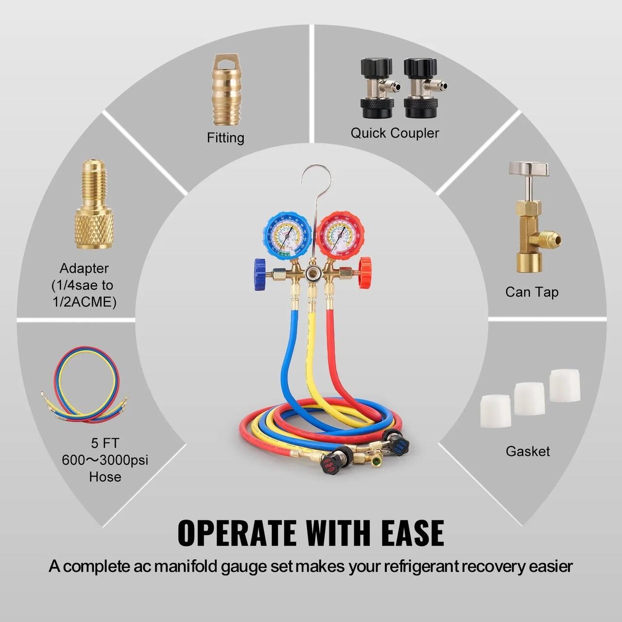 Set complet de manometre AC: 1 x manometru cu 3 supape, 2 x cuple rapide, 1 x adaptor (1/4sae la 1/2ACME), 1 x robinet, 3 x furtun de 5 ft (600~3000 psi), 1 x manual de instructiuni , 1 x carlig, 3 x garnitura, 1 x fiting. Un set complet de manometre pentru colector de curent alternativ usureaza recuperarea si umplerea agentului frigorific! Bucurati-va de o configurare si o functionare fara probleme in timp ce va rezolvati problemele HVAC din nas.