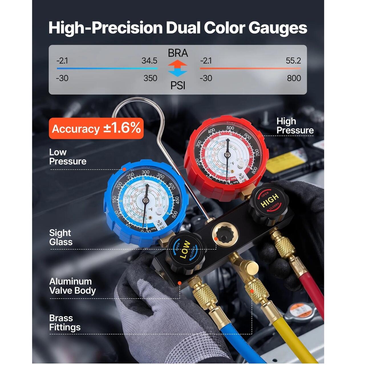 Indicatoare transparente cu scala dubla: Indicatorul pentru distribuitorul de curent alternativ are cadrane de presiune inalta si joasa codificate prin culori pentru o citire usoara. Suruburile de calibrare mentin o precizie de ±1,6%, in timp ce scalele de temperatura Fahrenheit si o fereastra de vizualizare ajuta la evaluarea nivelului de incarcare in timpul testarii.