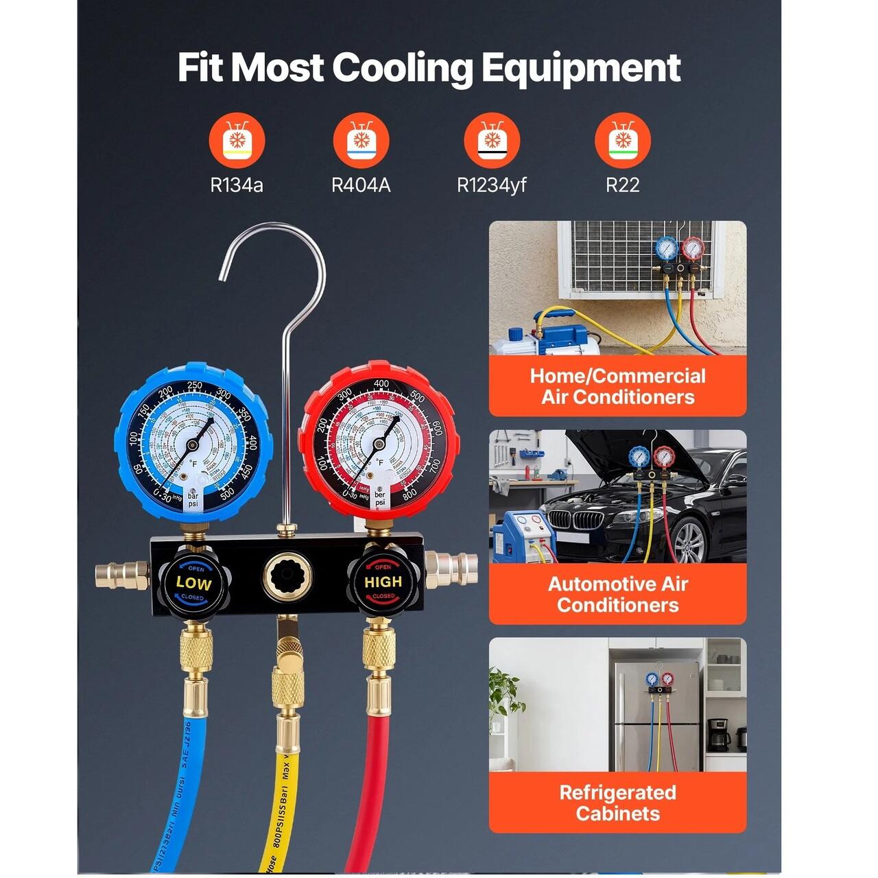 Functioneaza cu patru agenti frigorifici: Acest manometru AC cu 3 cai masoara cu precizie presiunea pentru R134a, R404A, R1234yf si R22. Este o solutie versatila pentru sistemele de aer conditionat auto, frigiderele de uz casnic si echipamentele de refrigerare la scara mica.
