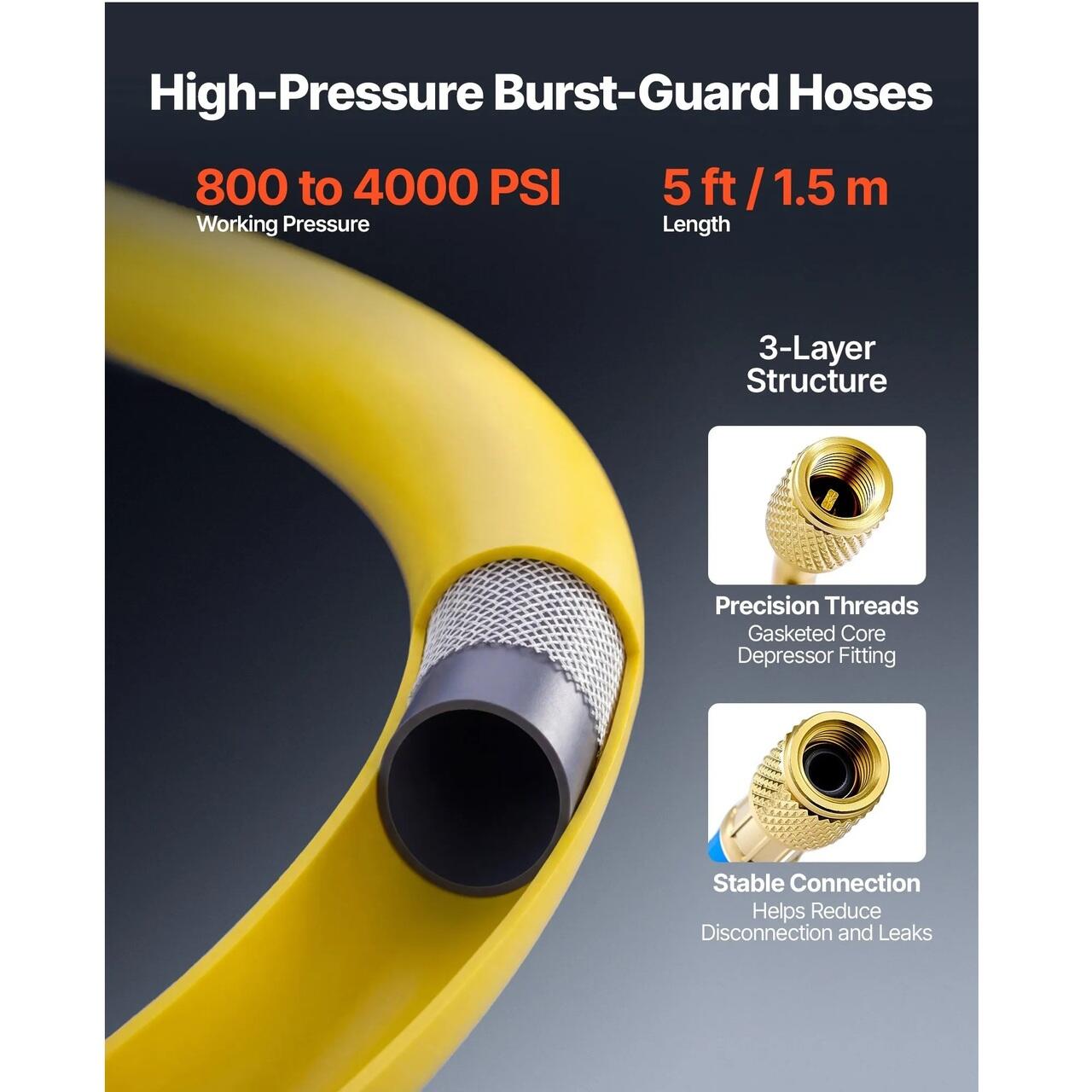Furtunuri de etansare de inalta presiune: Concepute pentru a se potrivi cu setul de manometre AC, cele patru furtunuri de cauciuc rezistente de 1,5 m sunt evaluate pentru o presiune de lucru de 800-4000 PSI. Fitingurile cu etansare si conectorii din alama ajuta la reducerea scurgerilor si la evitarea slabirii in timpul service-ului.