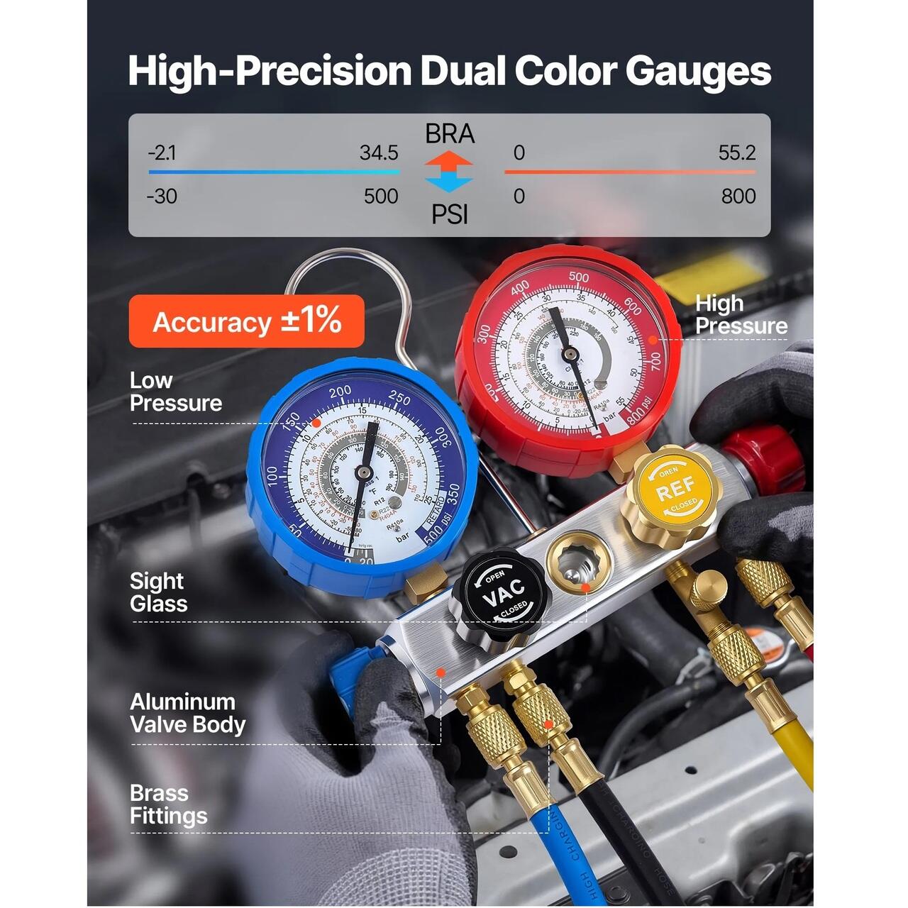 Indicatoare transparente cu scala dubla: Indicatorul pentru distribuitorul de curent alternativ are cadrane de presiune inalta si joasa codificate prin culori pentru o citire usoara. Suruburile de calibrare mentin o precizie de ±1%, in timp ce scalele de temperatura Fahrenheit si o fereastra de vizualizare ajuta la evaluarea nivelului de incarcare in timpul testarii.