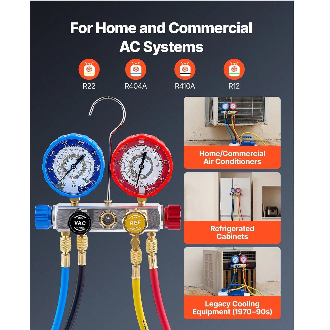 Functioneaza cu patru agenti frigorifici: Acest manometru AC cu 4 cai permite testarea presiunii pentru R22, R404A, R410A si R12. Este special conceput pentru unitati centrale de aer conditionat de uz casnic, echipamente de refrigerare comerciala si intretinerea sistemelor vechi.