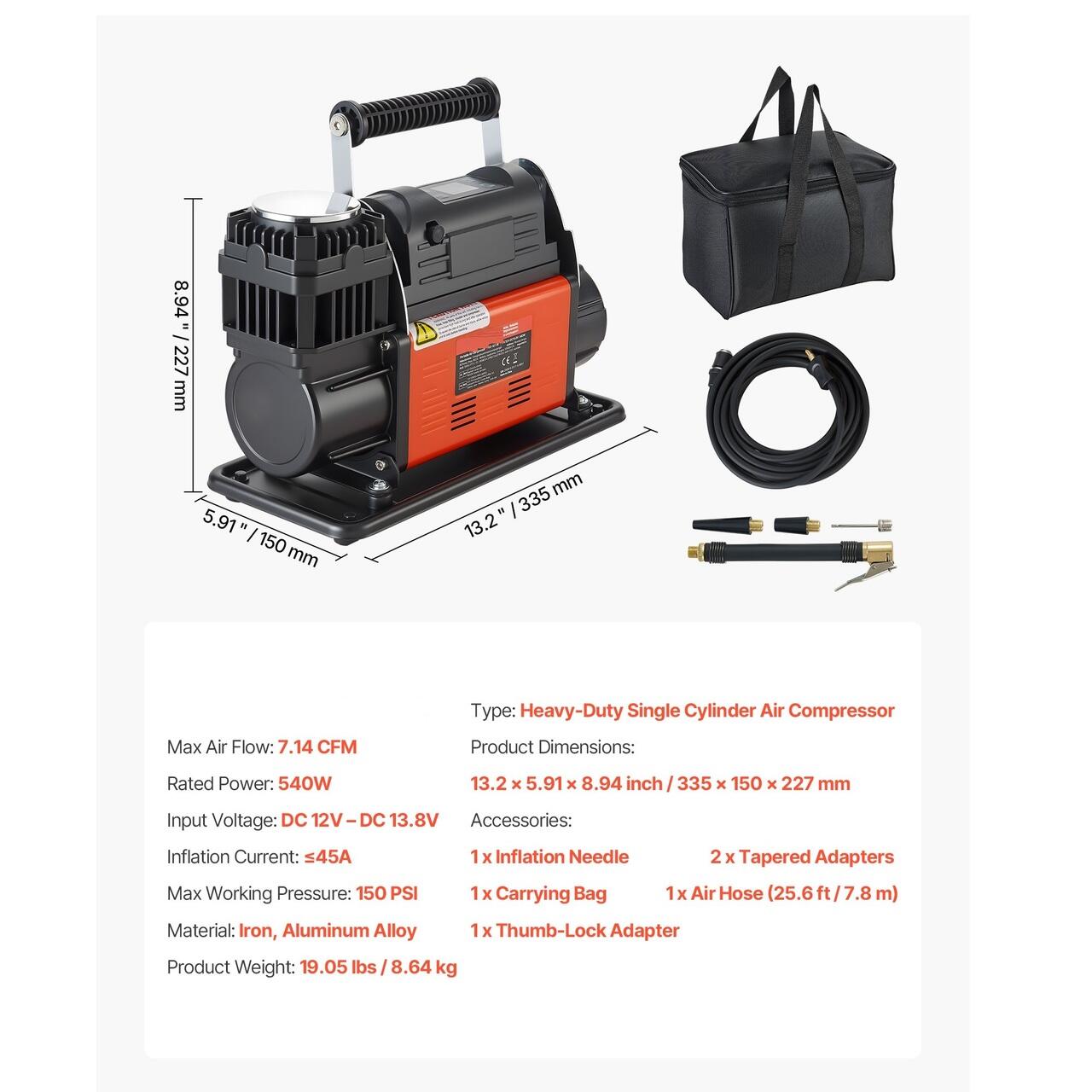 Pachet complet: Include compresor de aer rezistent cu cablu de alimentare de 2 m + furtun de aer din cauciuc de 7,8 m + 3 adaptoare pentru duze + adaptor cu blocare pentru degetul mare + geanta portabila pentru scule. Intotdeauna gata pentru aventura off-road.