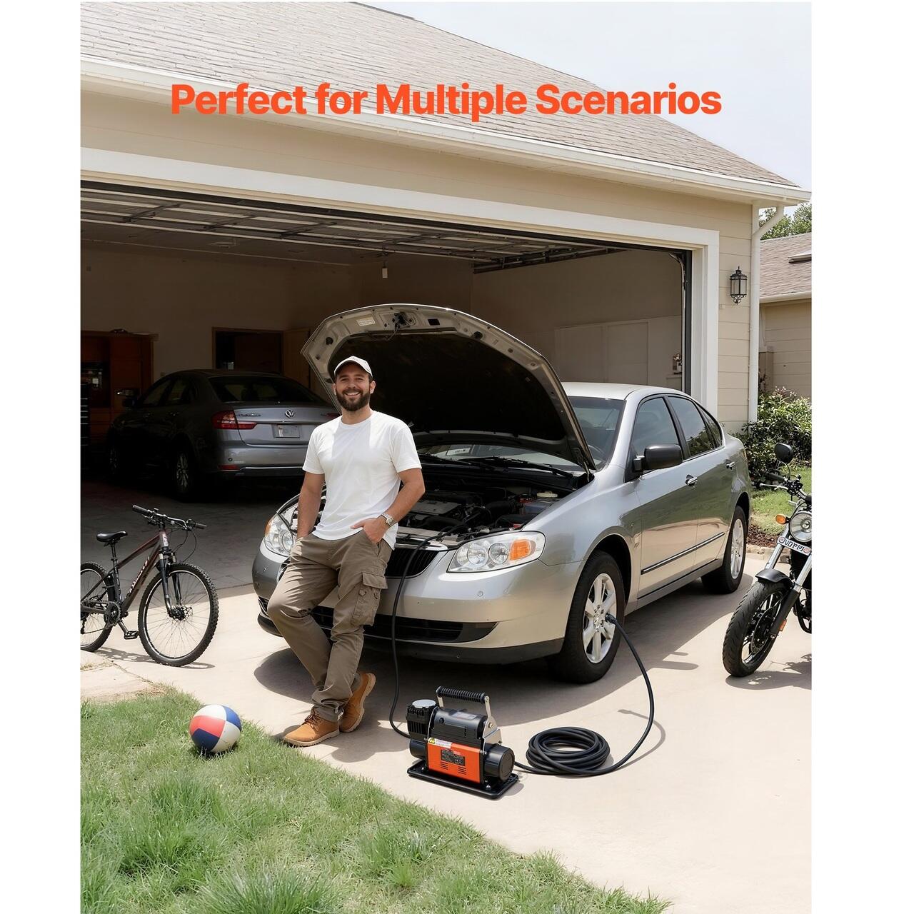 Umflare rapida si eficienta: Acest compresor de aer de 12V ofera un flux de aer eficient de 202 L/min si o presiune maxima de lucru de 150 PSI, asigurand umflarea rapida a anvelopelor in cateva minute. Va permite sa va intoarceti la drum in cel mai scurt timp.