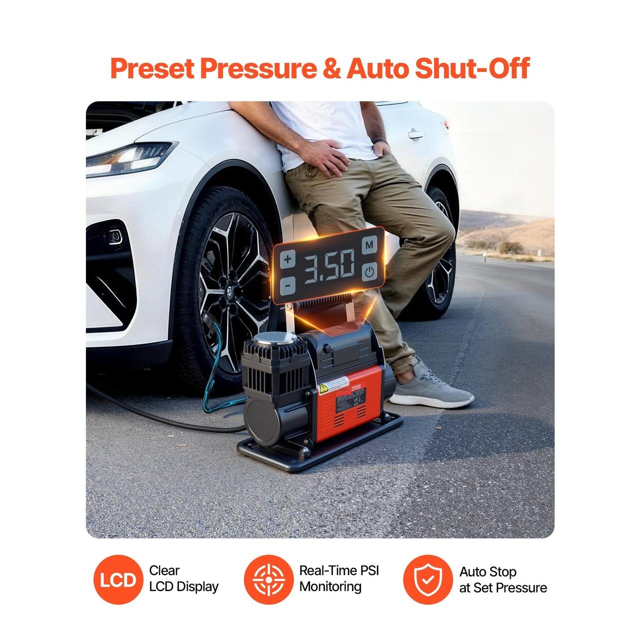 Presiune presetata si oprire automata: Pastrati controlul cu afisajul digital LCD care monitorizeaza presiunea in anvelope in timp real. Setati presiunea dorita, iar anvelopa se va opri automat cand este atinsa — eliminand supraumflarea, subumflarea si monitorizarea constanta a manometrului.