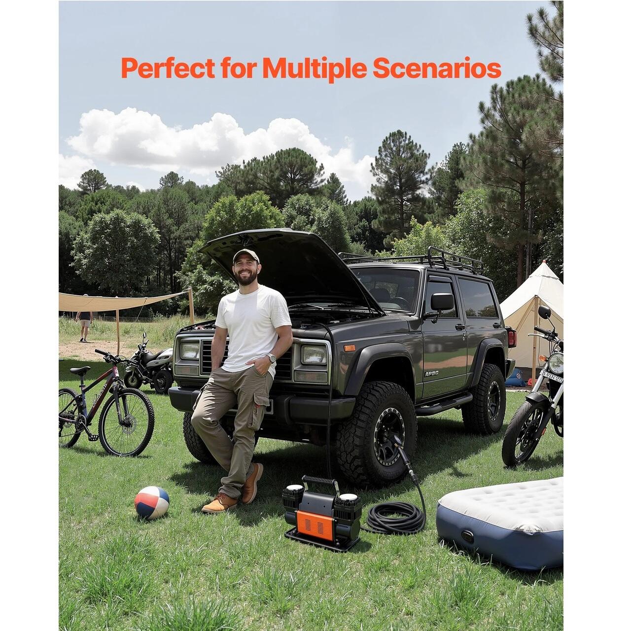 Umflare ultra-rapida: Cu un design imbunatatit cu doi cilindri, un debit de aer ridicat de 300 L/min si o presiune maxima de lucru de 150 PSI, compresorul nostru de aer de 12V 1080W se umfla de 2 ori mai repede decat altele, ajutandu-va sa va intoarceti pe drum in cel mai scurt timp.