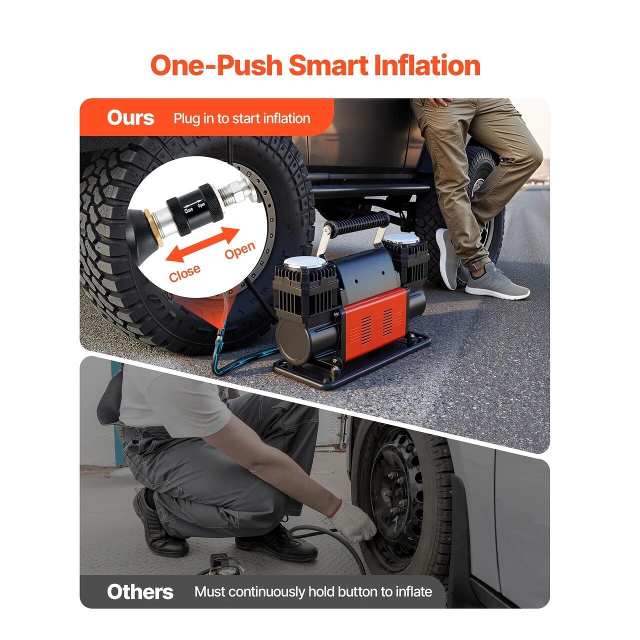 Operare usoara: Echipat cu un dispozitiv digital de umflare a anvelopelor cu manometru, pur si simplu apasati supapa pentru a „deschide” pentru o umflare continua, permitand o umflare eficienta si monitorizarea presiunii in timp real, fara a fi nevoie sa comutati/opriti in mod repetat compresorul de aer.